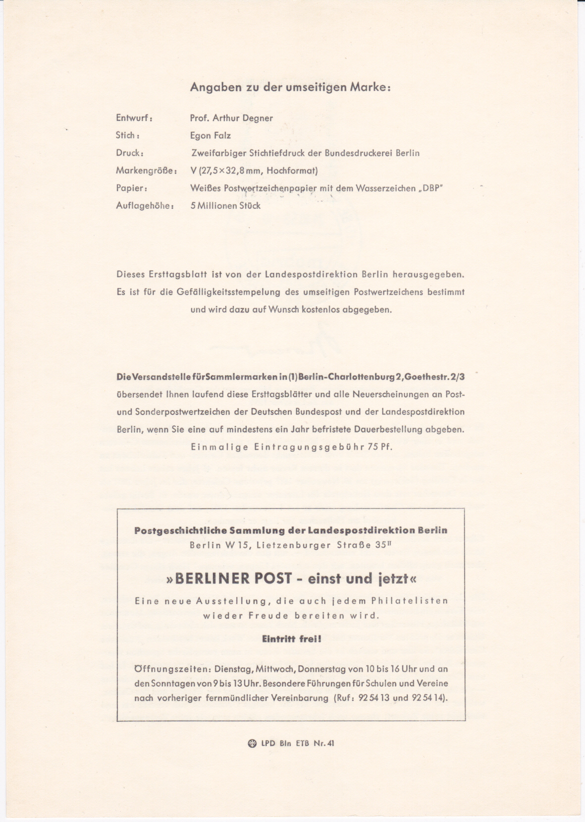 Hier zeige ich die Vorder- und Rückseite des ETB (MiNr ETB 41) mit der Marke zu 7 Pfennig (MiNr 163) mit Theodor Mommsen. Dieses ETB wurde mit einem Sonderstempel aus Berlin-Charlottenburg zum "Tag der Briefmarke" vom 24.10.1958 (Ersttag der Marke) gestempelt.