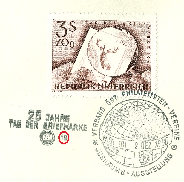 Das Markenmotiv zeigt einen Probeabzug der Originalplatte der Wertstufe zu S 3,70 der Jagdserie 1959 während der Sticharbeit, durch eine Lupe betrachtet. Der Probeabzug zeigt dem Stecher, wie weit die gewünschten Tonabstufungen in der Originalplatte bereits erreicht sind. Die Wichtigkeit des Kontrolldruckes ergibt sich aus der Tatsache, daß der Stecher nur eine Verstärkung der Linien und Punkte vornehmen kann. Ein Abschwächen der Linien würde auf Kosten der Drucksicherheit und damit der Sauberkeit des Stiches gehen. Bei Betrachtung eines Druckes mit einer Lupe, wie es die Darstellung der vorliegenden Briefmarke zeigt, ist die Linienführung dem Betrachter leicht erkennbar. Es ist der Erfahrung und Überlegung des Stechers überlassen, die Abstände der Linien und Punkte von Anfang an so vorzunehmen, daß nach Beendigung des Stiches die erreichten Tonabstufungen in der Kleinheit des Markenbildes dem Original des Entwerfers entsprechen.
