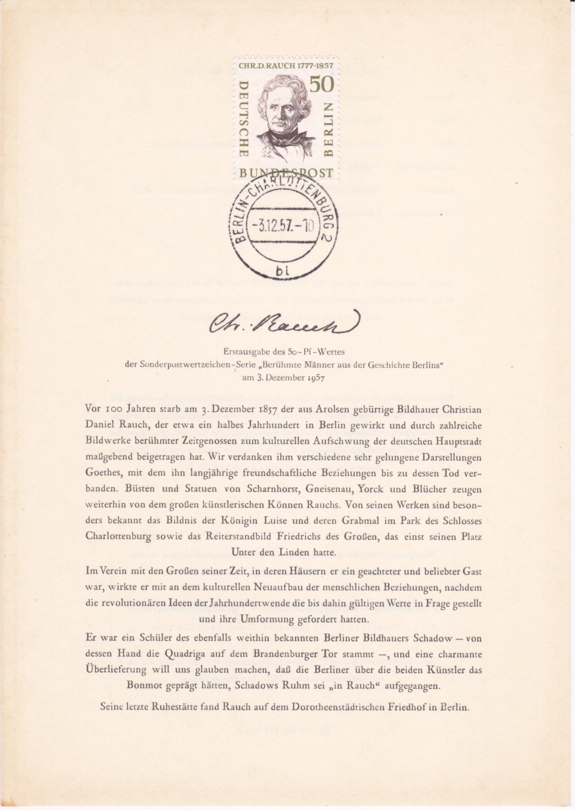 In der Serie "Männer aus der Geschichte Berlins" ist auch eine Marke zu 50 Pfennig (MiNr 172) mit dem Porträt von Christian Daniel Rauch erschienen.