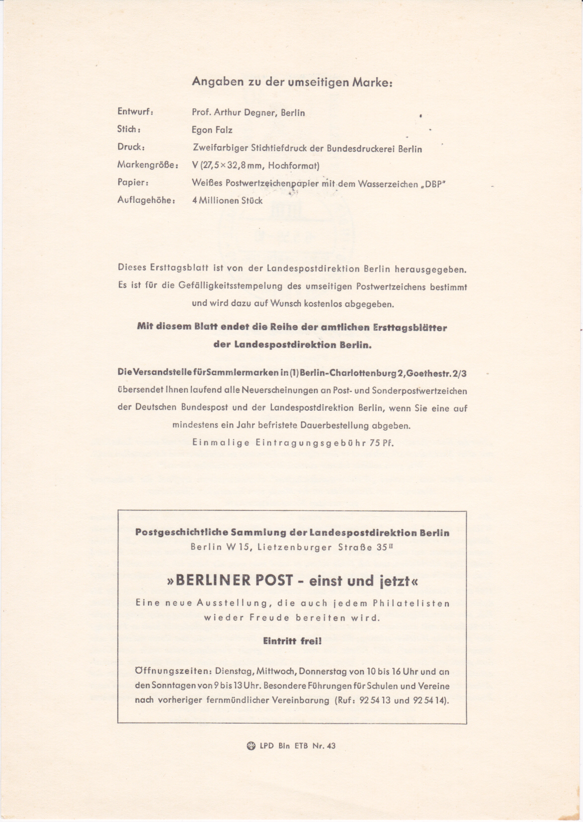 Hier zeige ich die Vorder- und Rückseite des ETB (MiNr ETB 43) mit der Marke zu 40 Pfennig (MiNr 171) mit dem Porträt von Alexander Freiherr von Humboldt. Dieses ETB wurde am Ersttag der Marke mit einem Sonderstempel aus Berlin zum Bundesvertretertag des Deutschen Beamtenbund in der Kongresshalle gestempelt.