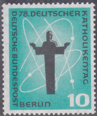 Dazu erschien in Berlin diese Marke zu 10 Pfennig (MiNr 179) mit einer Christusdarstellung und dem Kosmos-Symbol (Werbeplakat des Katholikentags).
