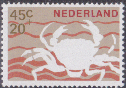 Diese Marke aus den Niederlande (MiNr 877) bildet eine Strandkrabbe (Carcinus maenas) ab.