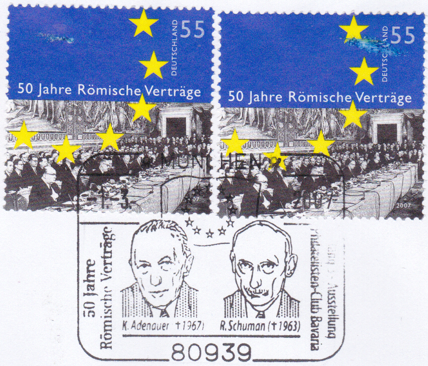 Brief per Einwurf-Einschreiben mit zwei Marken "50 Jahre Römische Verträge" (MiNr 2593) und einer Automatenmarke zu 1,50 € mit einem zum Thema passenden Sonderstempel 1.3.2007 aus München zu einer Briefmarkenausstellung. Das Porto beträgt für den Brief bis 20g 55 Cent und die Zusatzleistung Einwurf-Einschreiben 160 Cent, zusammen also 215 Cent. Wer das verklebte Porto addiert kommt auf 260 Cent. Dies ist der Preis zum Zeitpunkt der Versendung von einem Übergabe-Einschreiben!! Da hat der Postler leider das Kreuz falsch gesetzt!!