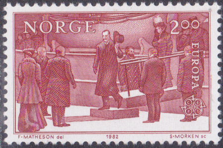 Eine zweite Europamarke 1982 (MiNr 866) zeigt dazu die Abbildung Kronprinz Olav empfängt König Haakon VII. im Jahre 1945.