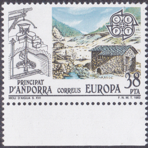 Bei der spanischen Post in Andorra erschienen die Europamarken 1983 zum Gemeinschaftsthema "Große Werke des menschlichen Geistes" am 7. Juni 1983. Hier die Marke zu 38 Peseten mit einer Wassermühle aus dem 16. Jahrhundert und einer Konstruktionszeichnung. Die Marke erschien in einer Auflage von 1 100 000 Stück.