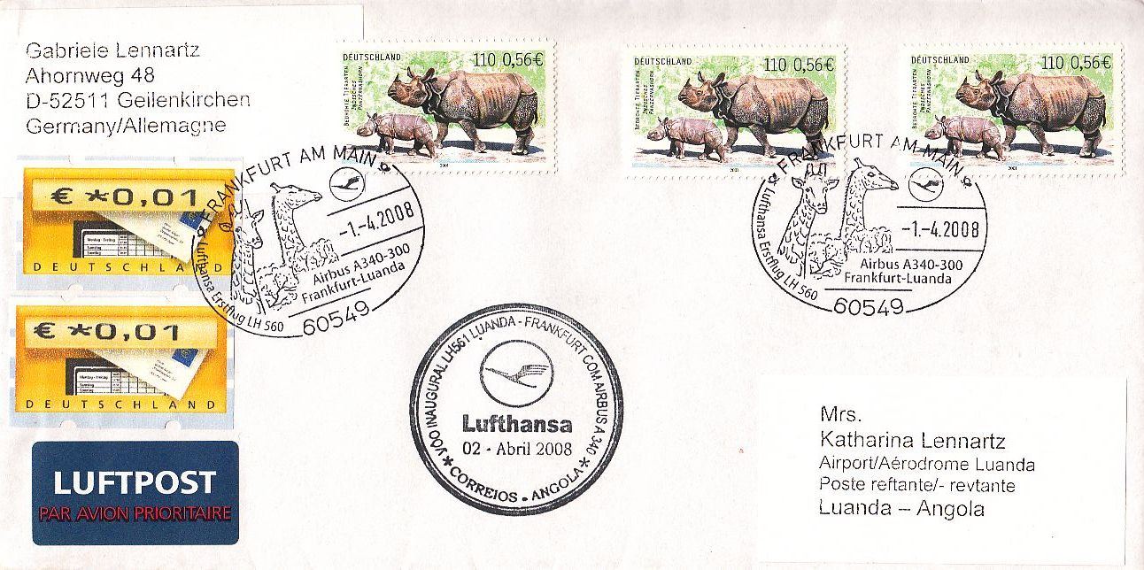 Dieser Brief wurde am 1. 4. 2008 mit dem Lufthansa-Erstflug mit einem Airbus A340-300 von Frankfurt nach Luanda befördert. Der große Lufthansastempel bestätigt die Ankunft in Angola am 2.4.2008. Da der Brief an eine Anschrift postlagernd versandt wurde und nicht abgeholt wurde, wurde er später retourniert. Leider wurde kein Rücksendevermerk angebracht.