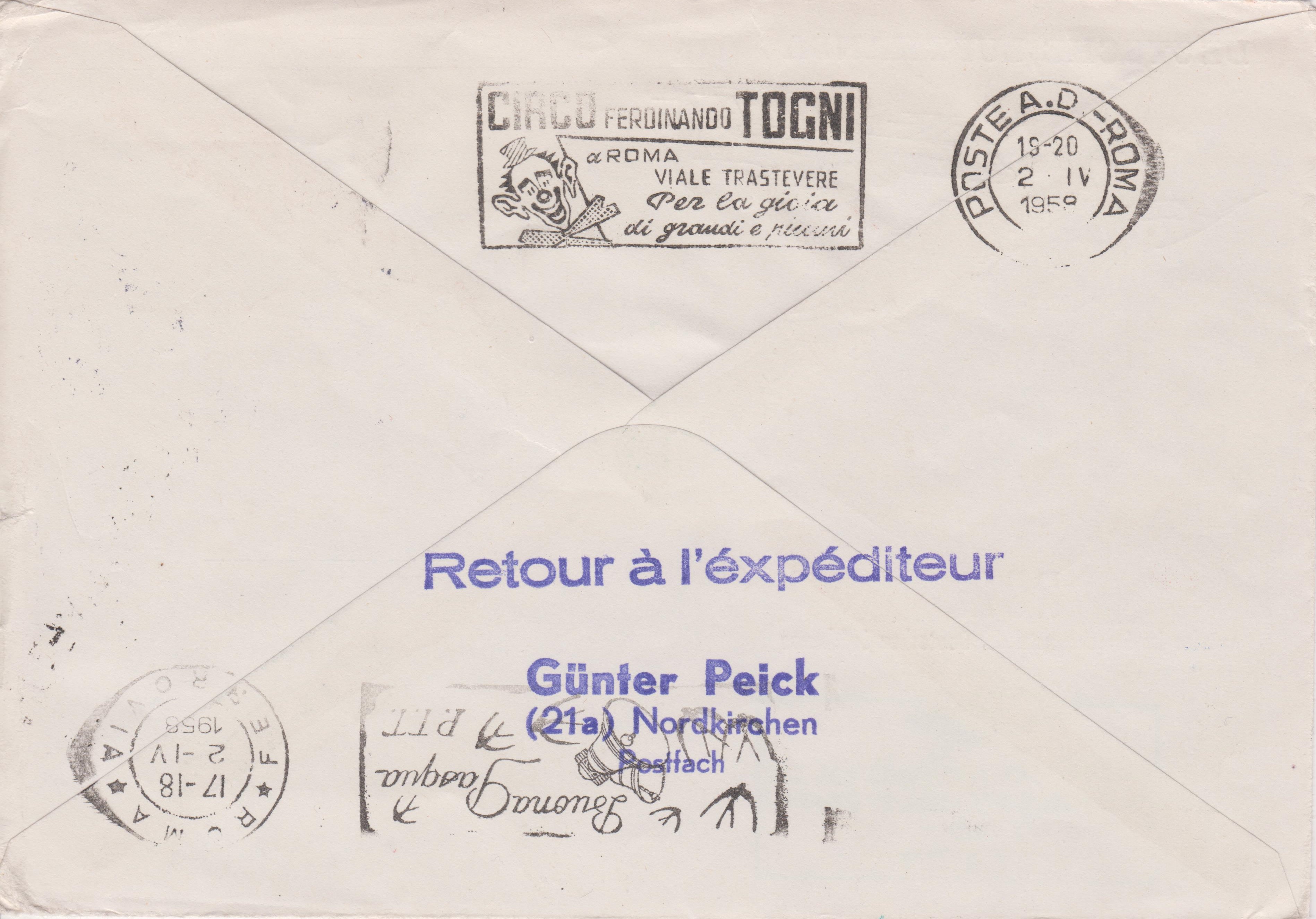 In Rom wurden rückseitig zwei verschiedene Maschinenstempel abgeschlagen, bevor dieser Beleg an den Absender nach Nordkirchen weitergeleitet wurde: