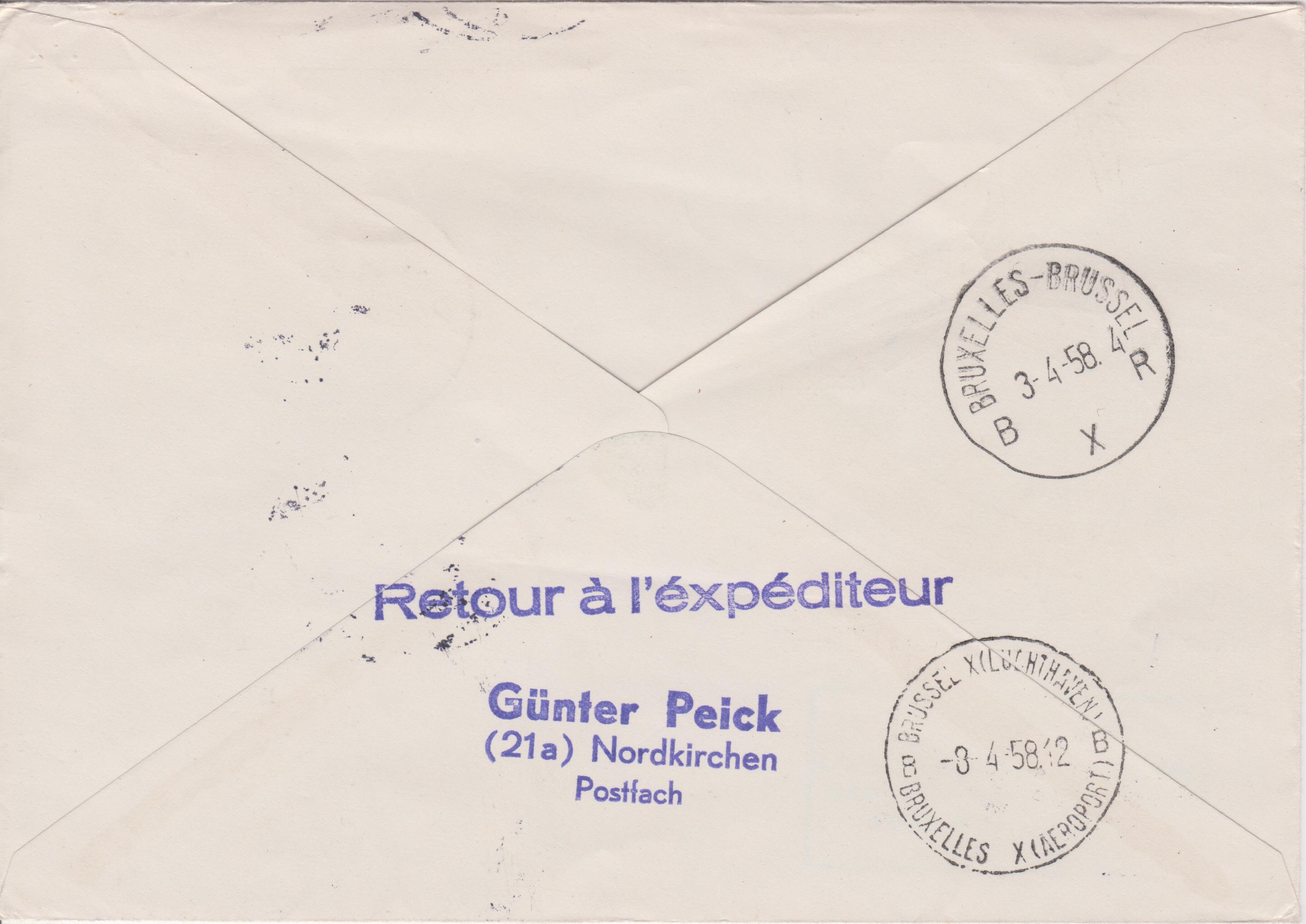 In Brüssel wurden rückseitig zwei verschiedene Tagesstempel abgeschlagen, bevor dieser Beleg nach 5 Tagen Lagerzeit an 08.04.1958 an den Absender nach Nordkirchen weitergeleitet wurde: