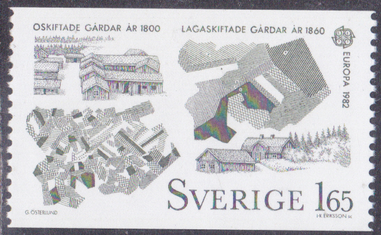 In Schweden erschienen die Europamarken 1982 am 26. April 1982 zum Gemeinschaftsthema "Historische Ereignisse". Hier die Marke zu 1,65 Kronen mit einer Abbildung zur Flurbereinigung im 19. Jahrhundert. Die Marke erschien in einer Auflage von 21 600 000 Stück.
