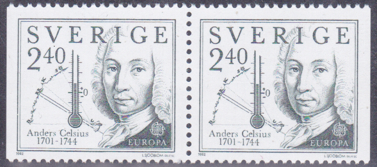 In Schweden erschienen die Europamarken 1982 am 26. April 1982 zum Gemeinschaftsthema "Historische Ereignisse". Hier die Marke zu 2,40 Kronen mit einem Porträt von Anders Celsius (1701-1744, Astronom, Mathematiker und Physiker). Die Marke erschien in einer Auflage von 12 500 000 Stück. Die Marke erschien in einem Heftchen, daher gibt es sie nur dreiseitig gezähnt. Hier zeige ich ein Paar dieser Marke (MiNr 1188 Dl/MiNr 1188 Dr).