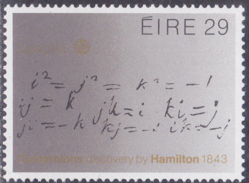 In Irland erschienen die Europamarken 1983 am 4. Mai 1983 zum Gemeinschaftsthema "Große Werke des menschlichen Geistes". Hier die Marke zu 29 Pence, die die Formeln für die Multiplikation von Quaternionen von William Rowan Hamilton (1805-1865, irischer Mathematiker und Physiker) zeigt. Die Marke erschien in einer Auflage von 1 000 000 Stück.