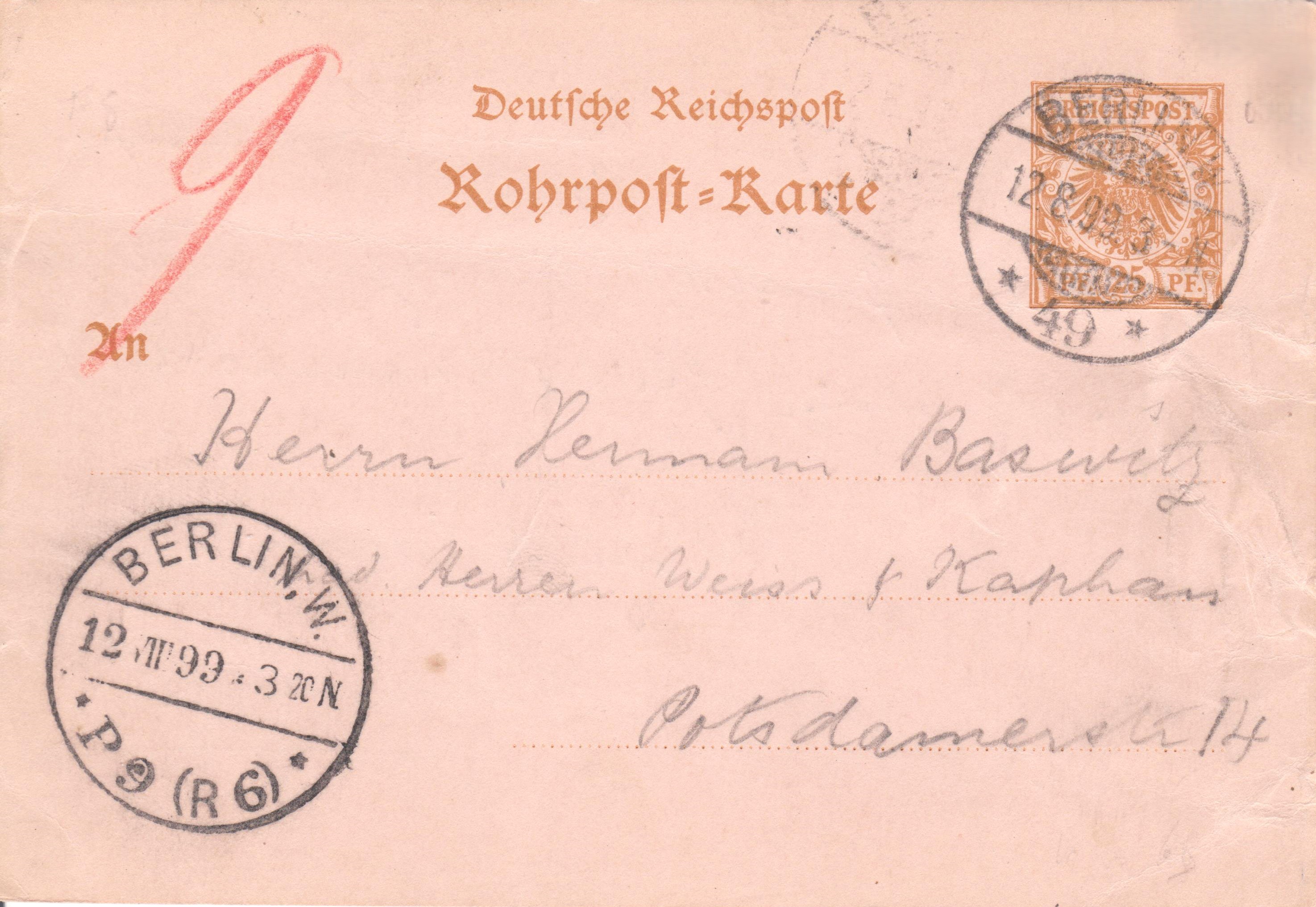 "Deutsche Reichspost Rohrpost=Karte", aufgegeben am 12.08.1899 in BERLIN W 49, handschriftlicher Leitvermerk in Rot "9", per Rohrpost befördert nach BERLIN, W. P 9 (R 6):