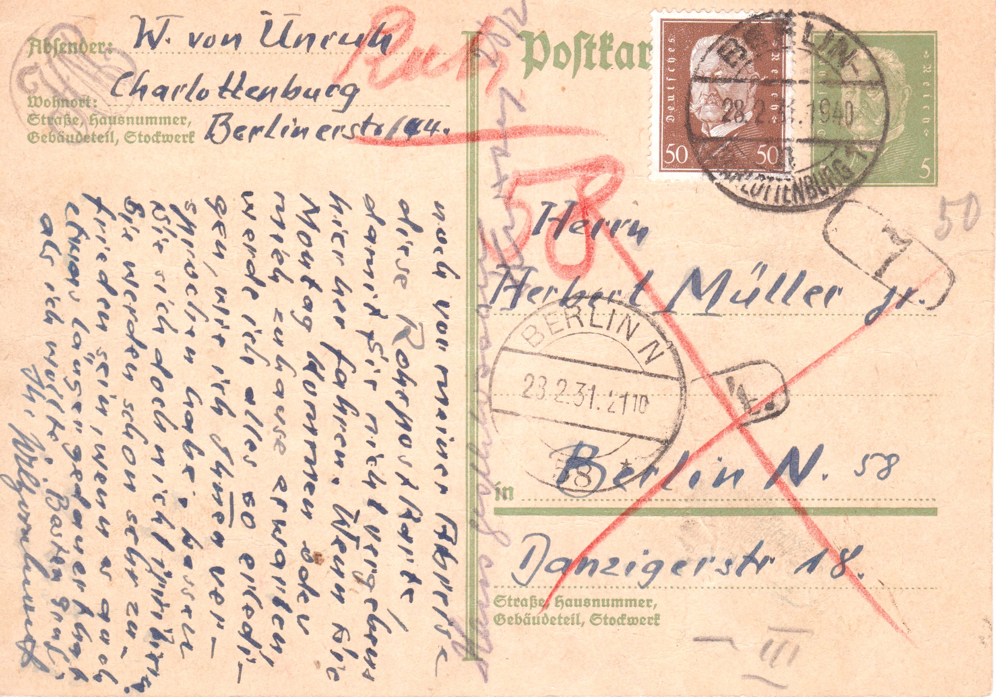 "Rohrpost=Brief", aufgegeben am 20.12.1893 in BERLIN N. W., handschriftlicher Leitvermerk in Rot "9", per Rohrpost befördert nach BERLIN, W. P 9 (R 6):