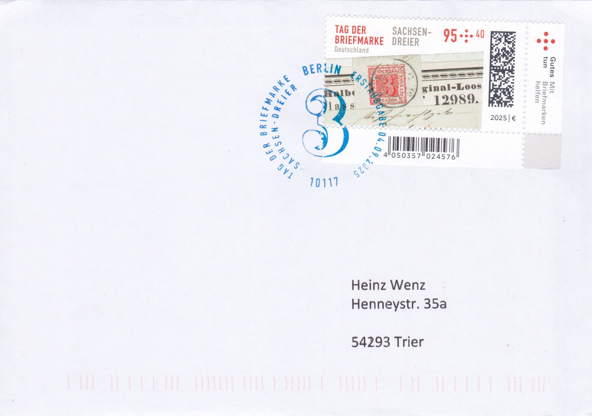 Am 4. September 2025 erschien bei der Deutschen Post eine Marke (MiNr 3923) zum Tag der Briefmarke 2025. Sie zeigt die Freimarke Sachsen MiNr. 1 vom 1. Juli 1850 auf Streifband, gestempelt am 4. Mai 1851 in Leipzig. Hier zeige ich eine Marke vom Eckrand mit EAN-Codierung.
