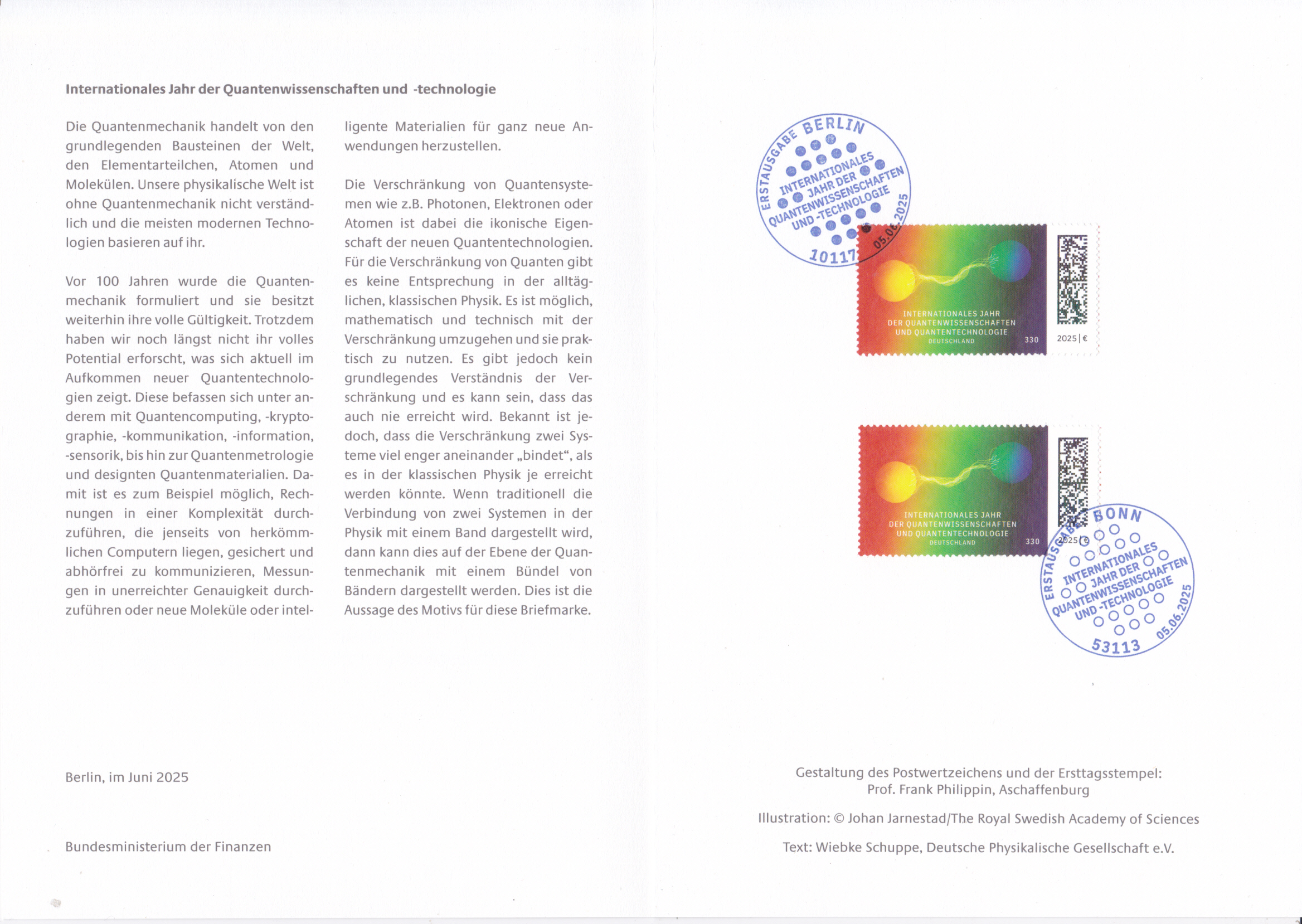 Ministerkarte des Bundesministers für Finanzen mit zwei Marken "Internationales Jahr der Quantenwissenschaften und Quantentechnologie" (MiNr 3913) mit den beiden Ersttagsonderstempel Bonn und Berlin.