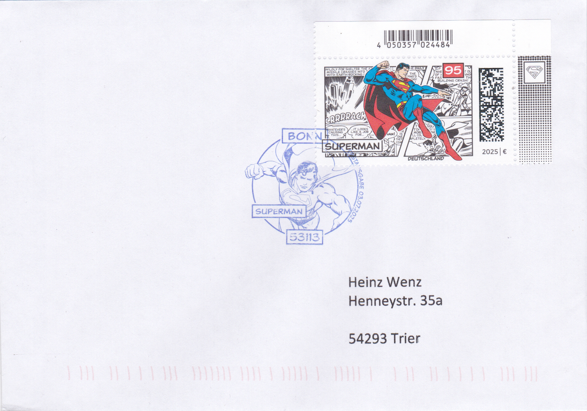 In der Serie "Superhelden" erschien bei der Deutschen Post diese Marke (MiNr 3916) mit der Darstellung von Superman (Clark Kent, Journalist) im Flug. Hier zeige ich ein Eckrandstück mit EAN-Codierung.
