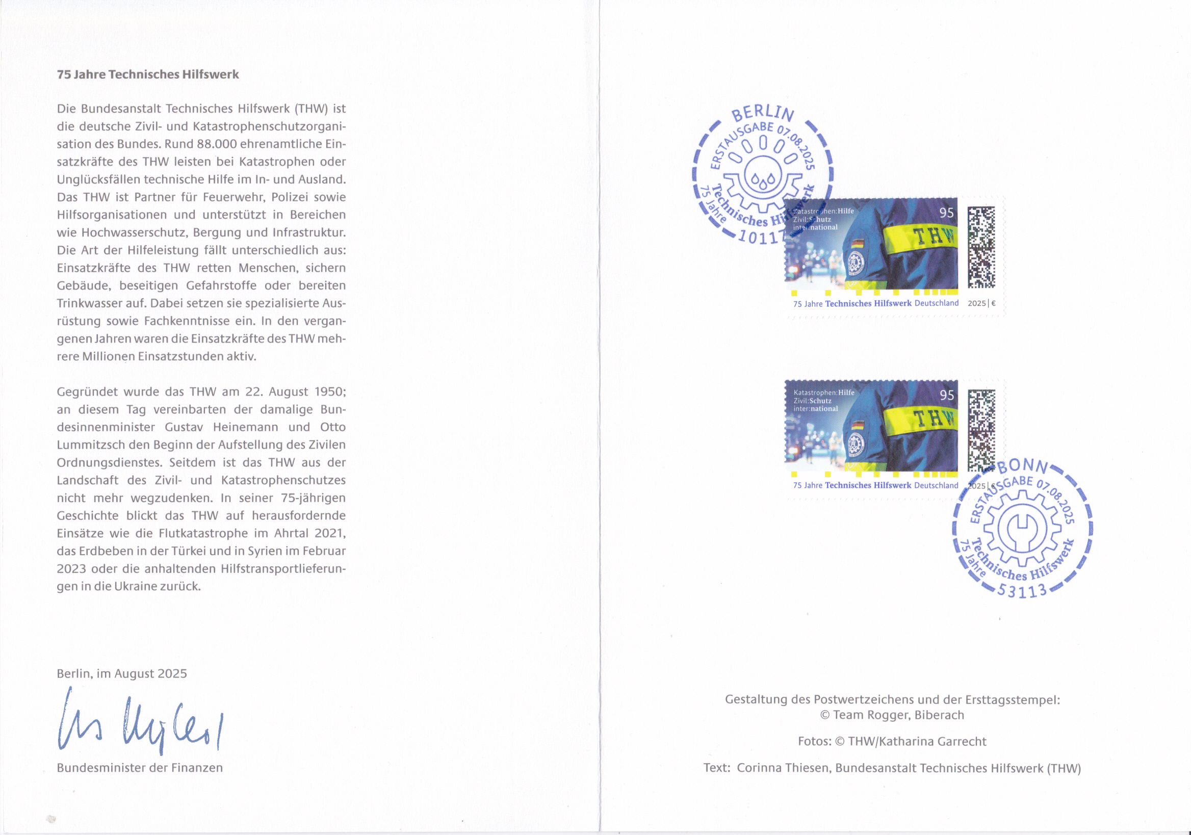 Ministerkarte des Bundesministers für Finanzen mit zwei Marken "75 Jahre Technisches Hilfswerk" (MiNr 3922) mit den beiden Ersttagsonderstempel Bonn und Berlin.