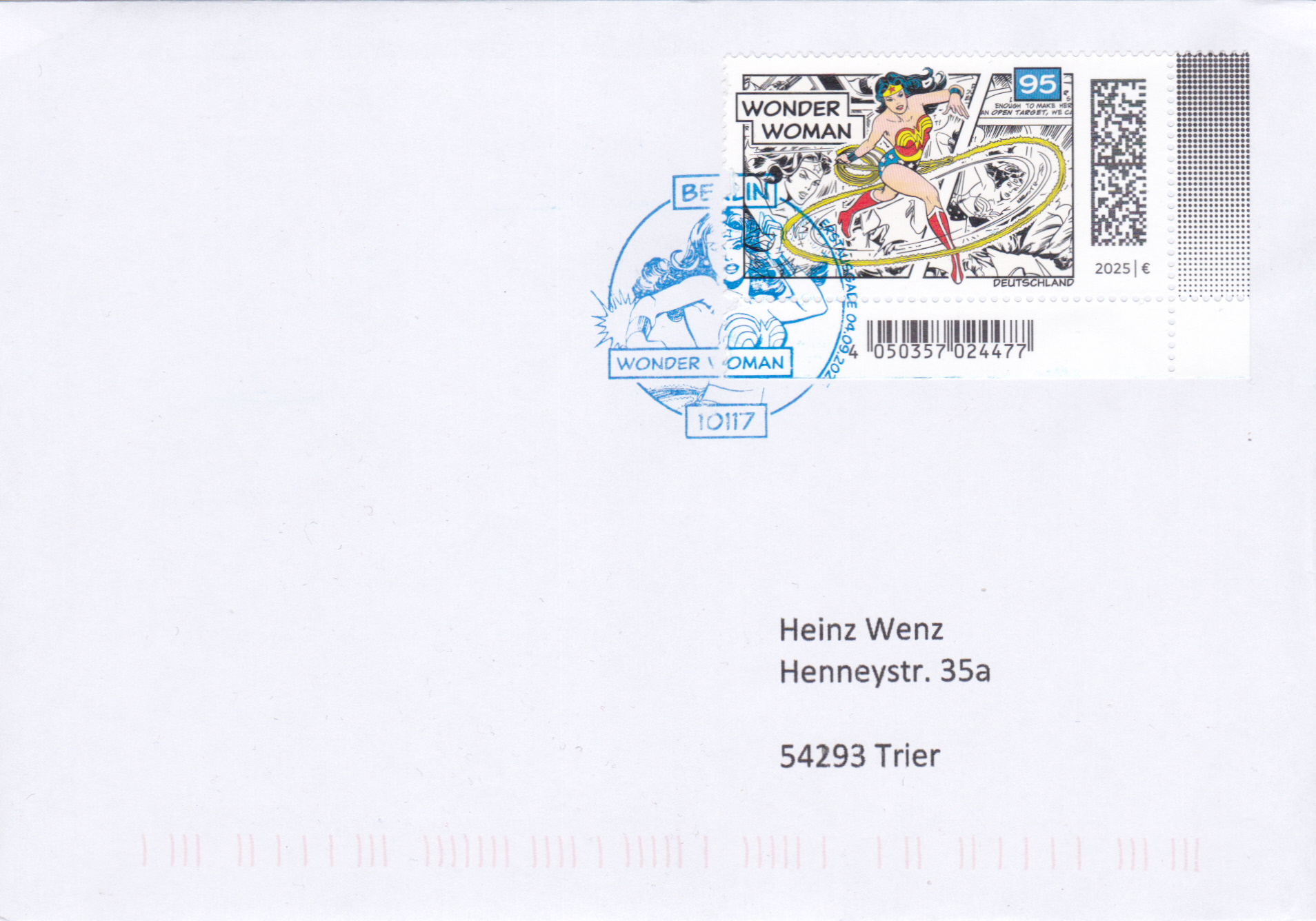 Bei der Deutschen Post ist eine Marke (MiNr 3925) mit der Abbildung Wonder Woman (Diana Prince, eigentlich Diana von Themyscira, Amazonenprinzessin) mit Lasso erschienen. Hier zeige ich eine Marke vom Eckrand mit EAN-Codierung.