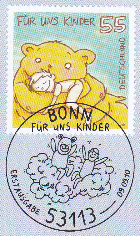 Die Marke "Für uns Kinder" (MiNr 2818) der Deutschen Post ist gestempelt mit dem dazu passenden Ersttagsonderstempel Bonn, der auch einen Teddybär zeigt.