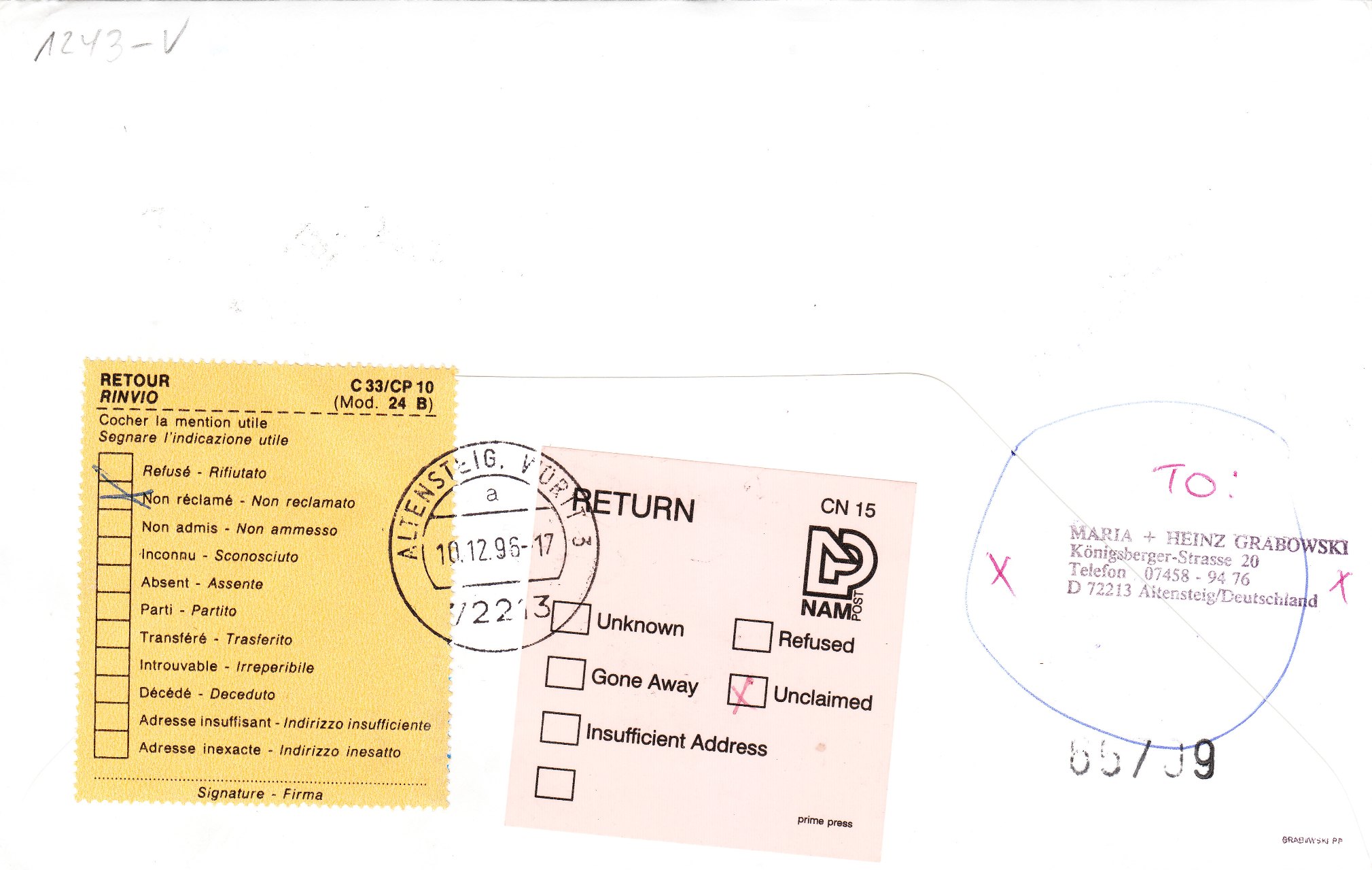 Im Unterschied zu dem bereits gezeigten Beleg trägt dieser auf der Rückseite einen zusätzlichen Klebezettel der namibischen Post: