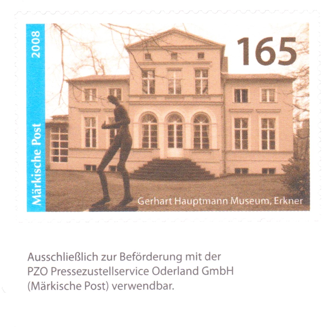 165 Cent selbstklebend vom unteren Rand des Zehnerbogens mit Zudruck "Ausschließlich zur Beförderung mit der PZO Pressezustellservice Oderland GmbH (Märkische Post) verwendbar.":