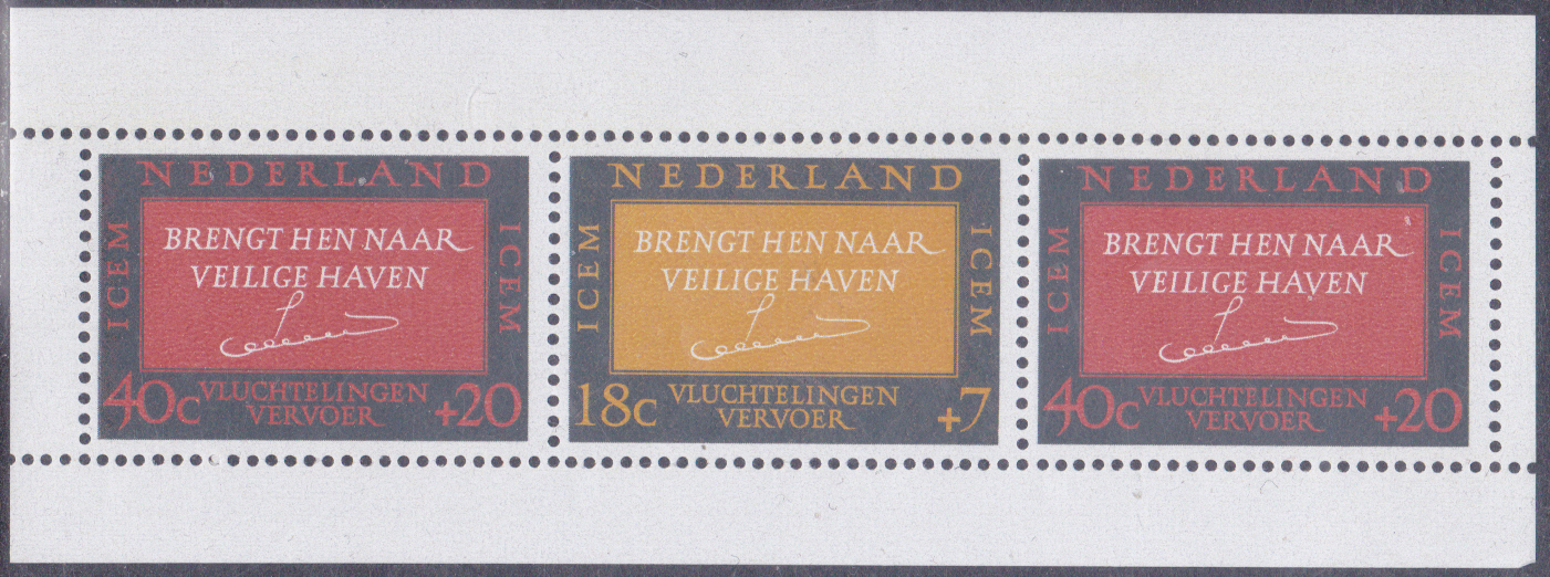 Eine Markenausgabe zum Thema "Zwischenstaatliches Komitee für europäische Auswanderung (ICEM)" zeigt einen Aufruf von Königin Juliana: „Verhelft ihnen zu einem sicheren Hafen“ und Namenszug der Königin.