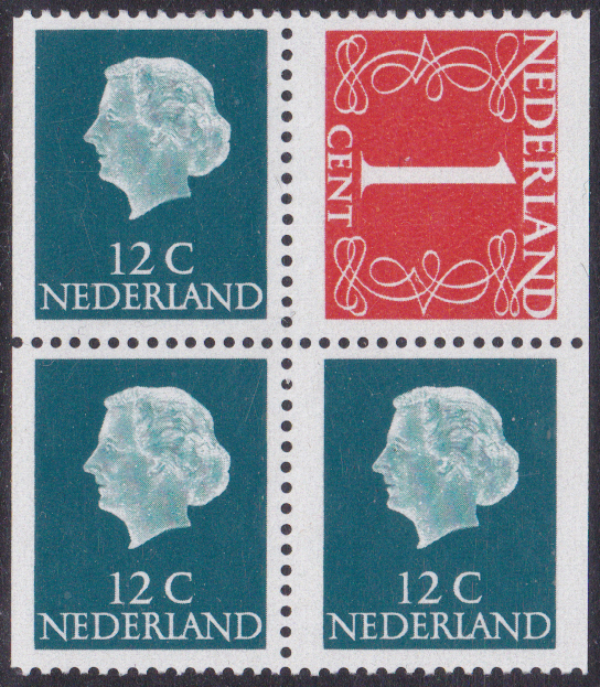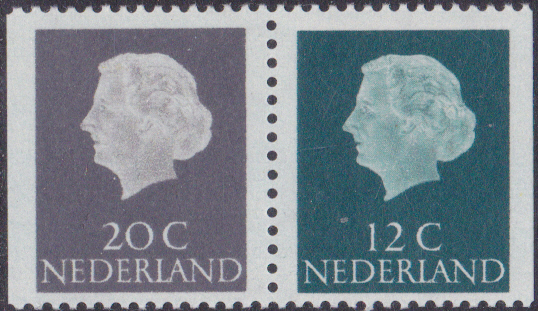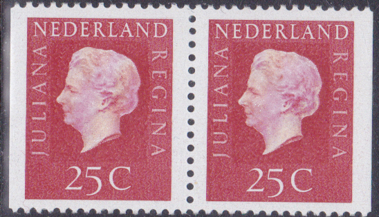 Ab 1969 erschienen Freimarken mit dem Bildnis von Königin Juliana in neuer Zeichnung. Die erste Marken sind in einem Markenheftchen erschienen. Hier zeige ich ein waagerechtes Paar aus einem Markenheftchen (MiNr Paar 910 a x Dl/Dr).