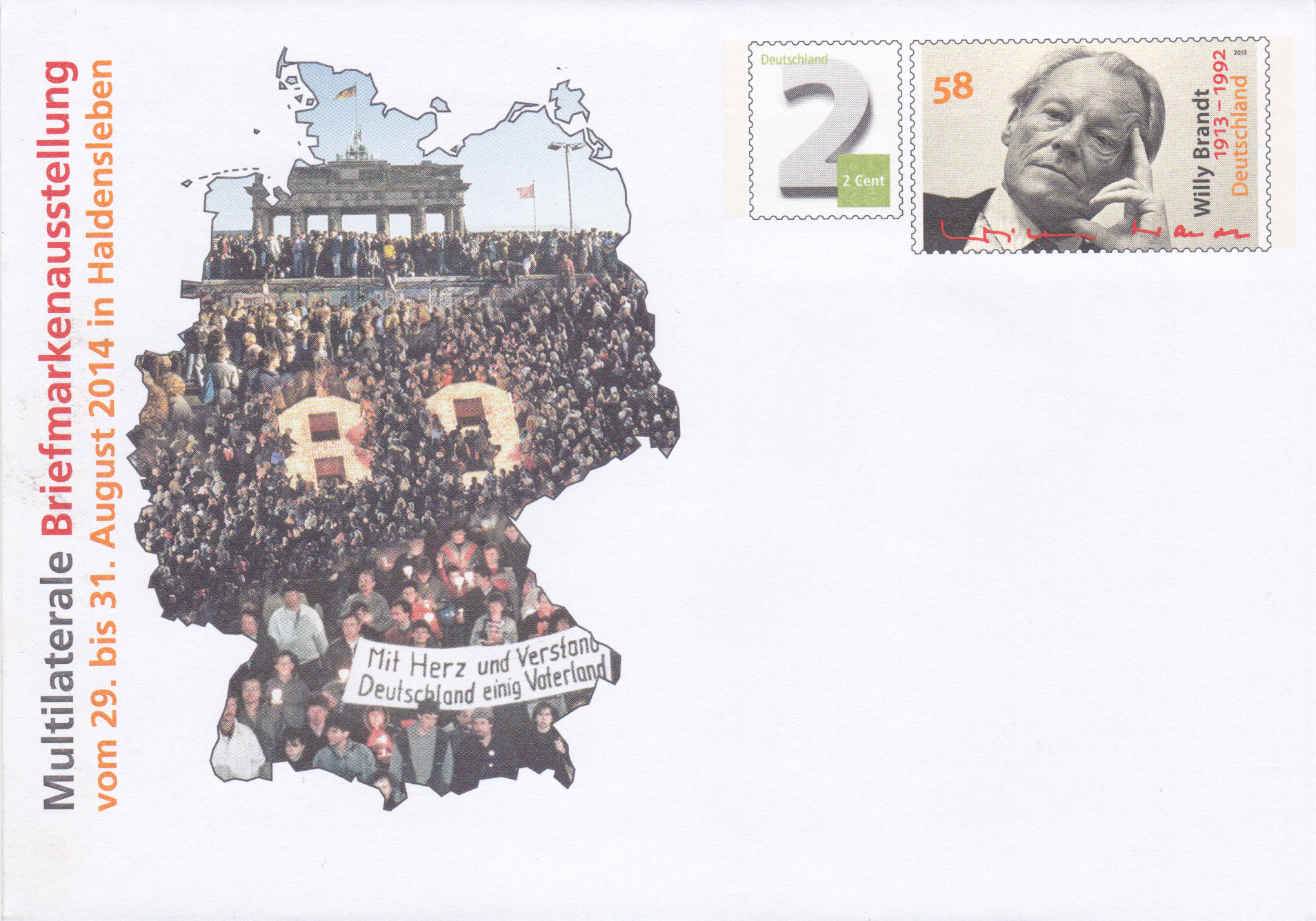Sonderumschlag mit dem Wertstempel im Muster der Marke zum 100. Geburtstag von Willy Brandt (MiNr 3037) und einem Wertstempel zu 2 Cent zur Multilateralen Briefmarkenausstellung in Haldensleben.