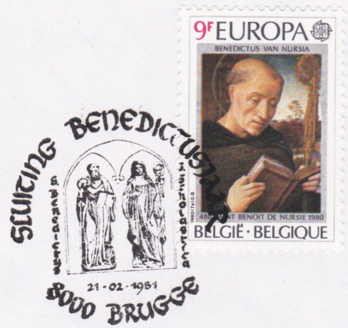 In Belgien erschienen die Europamarken 1980 zum Gemeinschaftsthema "Bedeutende Persönlichkeiten" am 26. April 1980. Hier die Marke zu 9 Francs mit der Abbildung des Hl. Benedikt von Nursia (480-547, Ordensgründer). Die Auflage betrug 10 000 000 Stück.