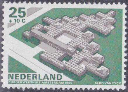 Auf einer Marke aus den Niederlande (MiNr 918) wird das Bürgerwaisenhaus in Amsterdam von Aldo van Eyck aus der Luft gezeigt.