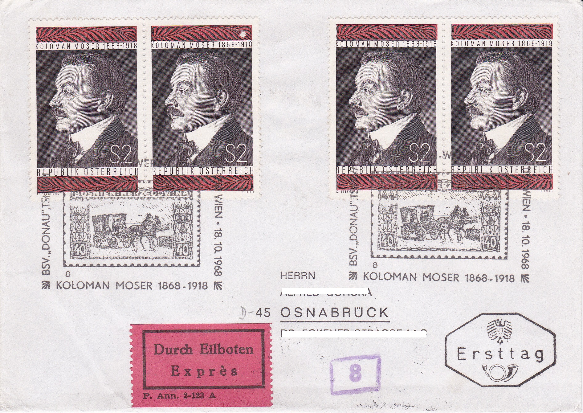 Auf diesem Brief mit Eilzustellung von Wien nach Osnabrück wurden sechs Marken "50. Todestag von Koloman Moser" mit einem Sonderstempel vom 18.10.1968 aus Wien zur Markenausgabe gestempelt. Der Stempel zeigt das Markenbild der Marke von Bosnien und Herzegowina MiNr 39 aus der Freimarkenserie von 1906, deren Entwürfe von Koloman Moser stammen. Der Stempel hat die Kennziffer "8".