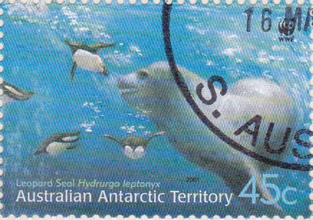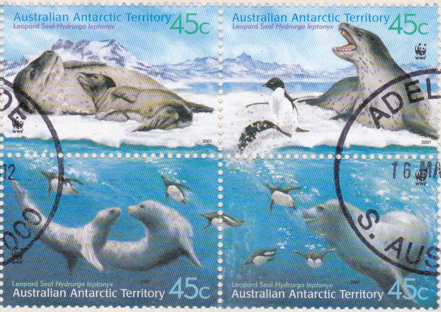Aus den Australischen Gebiete in der Antarktis kommt diese Marke (MiNr 145) mit einem Seeleopard-Weibchen mit Jungem