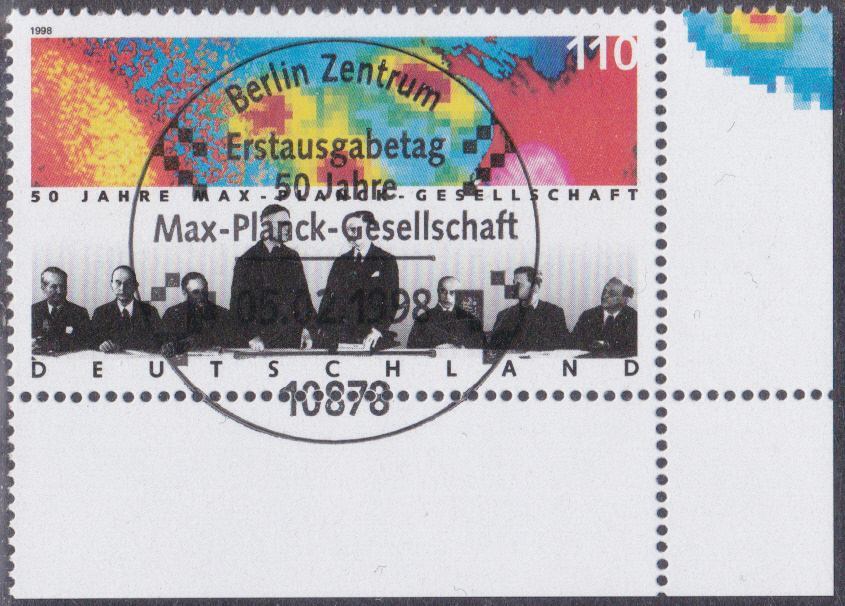 Zum Jubiläum "50 Jahre Max-Planck-Gesellschaft zur Förderung der Wissenschaften e.V." erschien bei der Deutschen Post eine Marke (MiNr 1973). Hier zeige ich ein postfrisches Exemplar vom Eckrand.