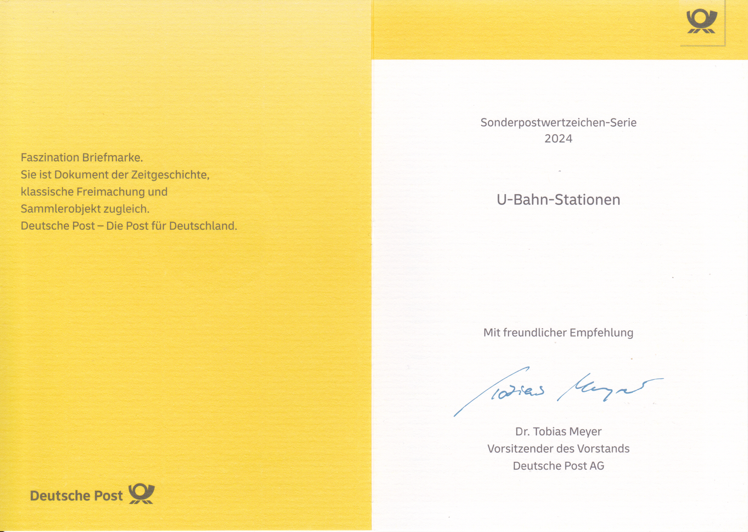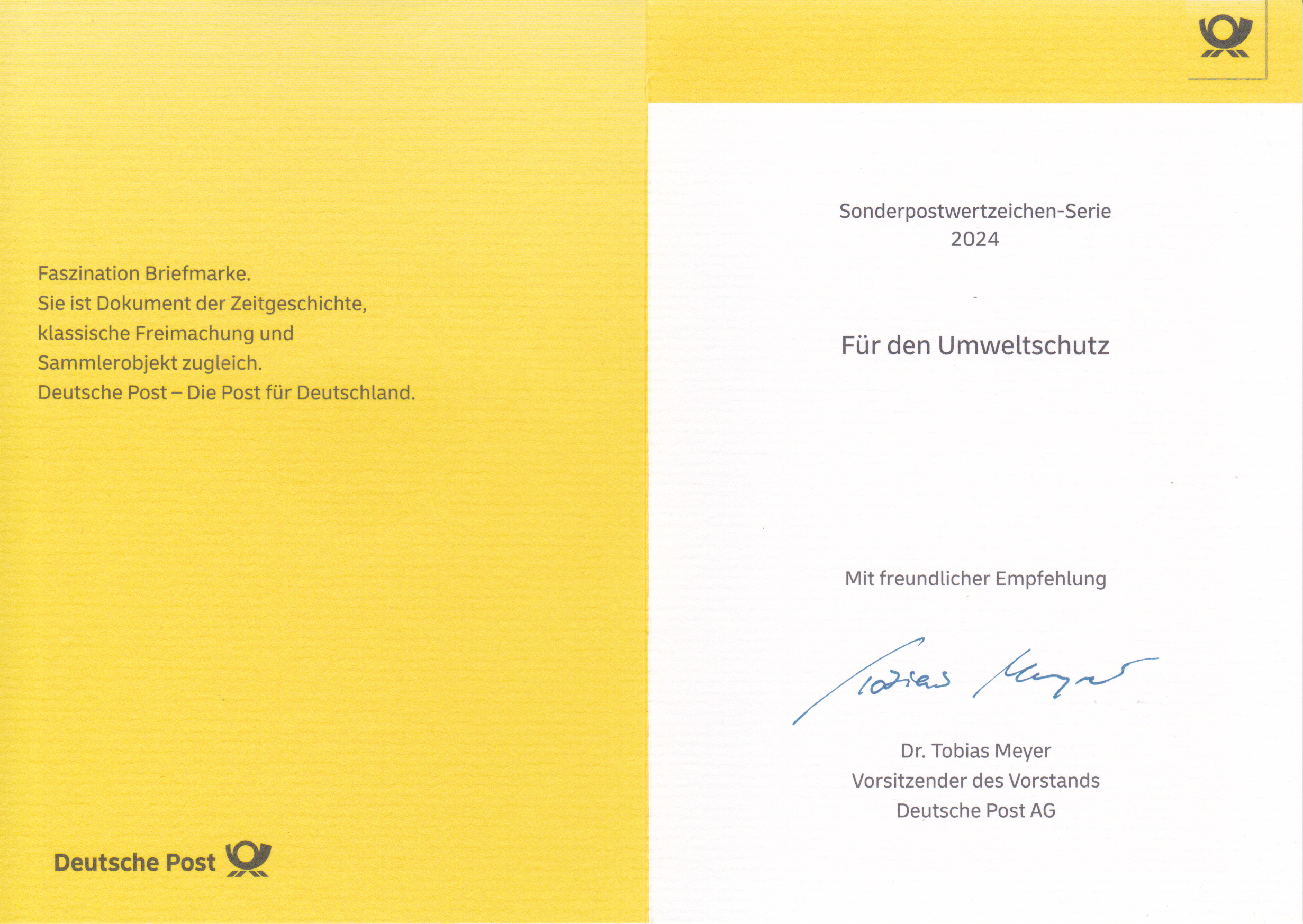 Klappkarte des Vorstandsvorsitzenden der Deutschen Post AG mit der Marke (MiNr 3841) "Bischof Ulrich von Augsburg" mit der Abbildung der Statue Bischof Ulrichs von Augsburg (890-973), geschaffen von Klaus Backmund (1929-2020; deutscher Bildhauer) und dem Ersttagsonderstempel Bonn.