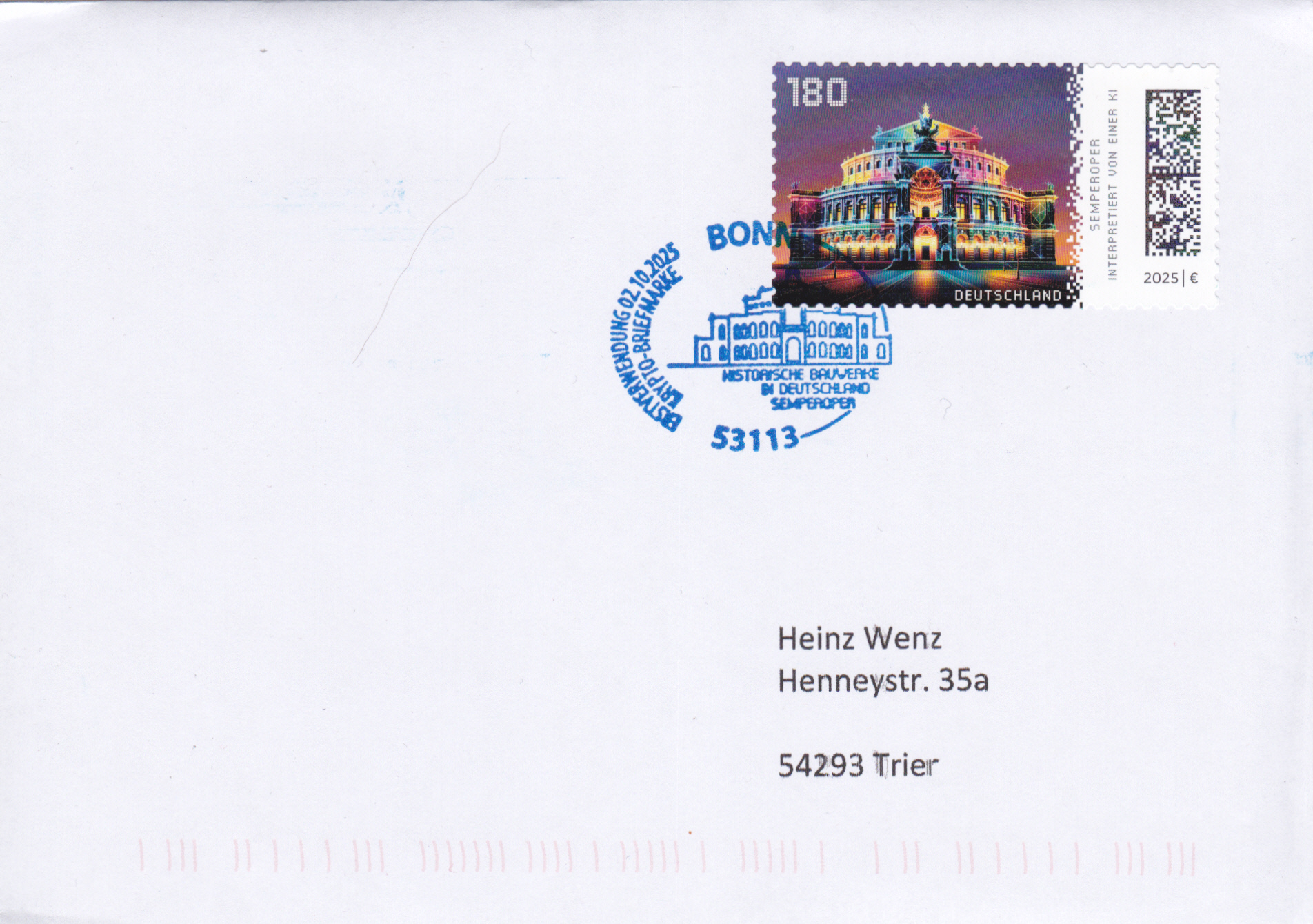 Brief vom Ersttag mit der selbstklebendem Marke (MiNr 3931) mit der Semperoper in Dresden und dem Erstverwendungsstempel Bonn.