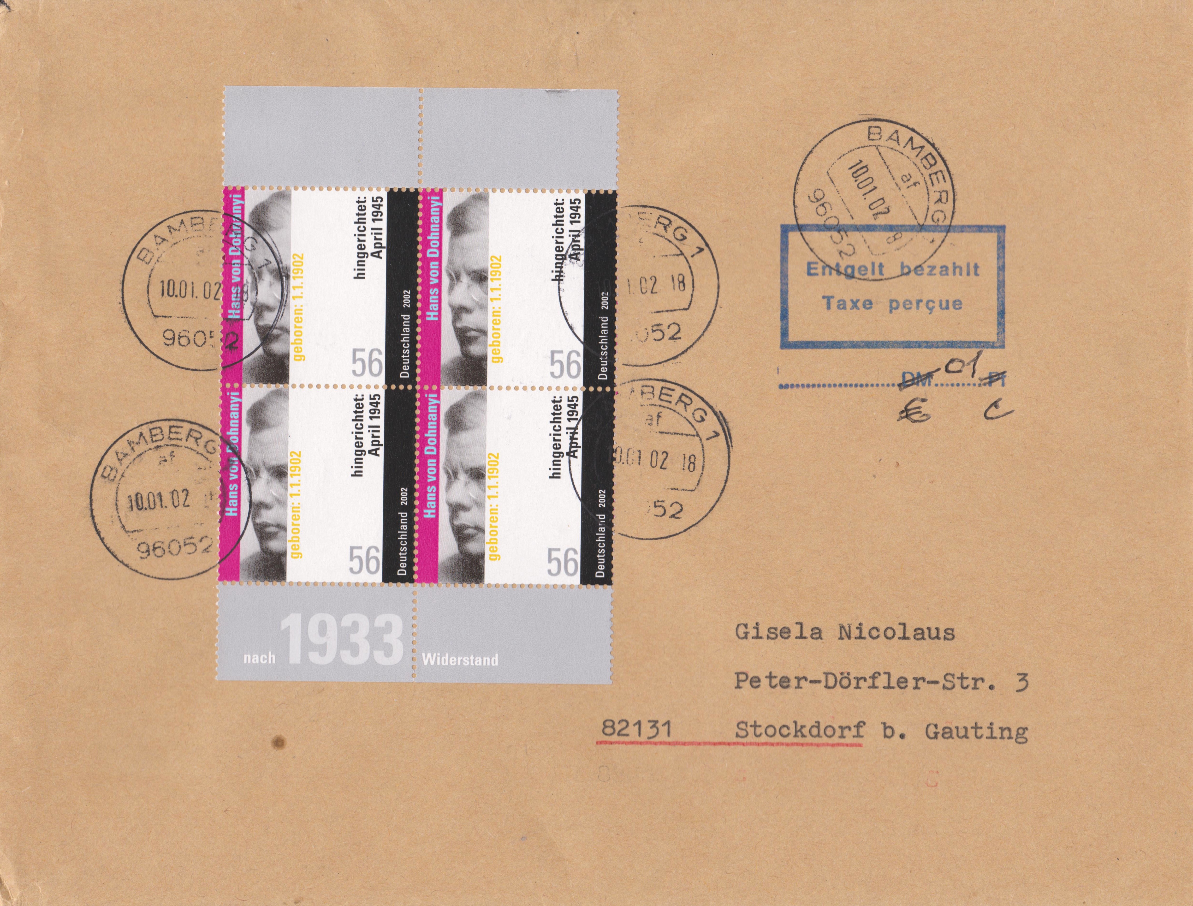 Frankiert wurde der Brief am 10.01.2002 (= Erstausgabetag!) mit einnem Viererblock, MiNr. 2234, der Wertstufe 0,56 €, also mit 2,24 €.