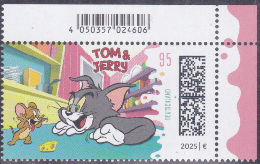 In der Serie "Helden der Kindheit" ist bei der Deutschen Post eine Marke (MiNr 3929) mit einer Szenen "Tom lockt Jerry mit Käse". Hier zeige ich eine Marke vom Eckrand mit EAN-Codierung.