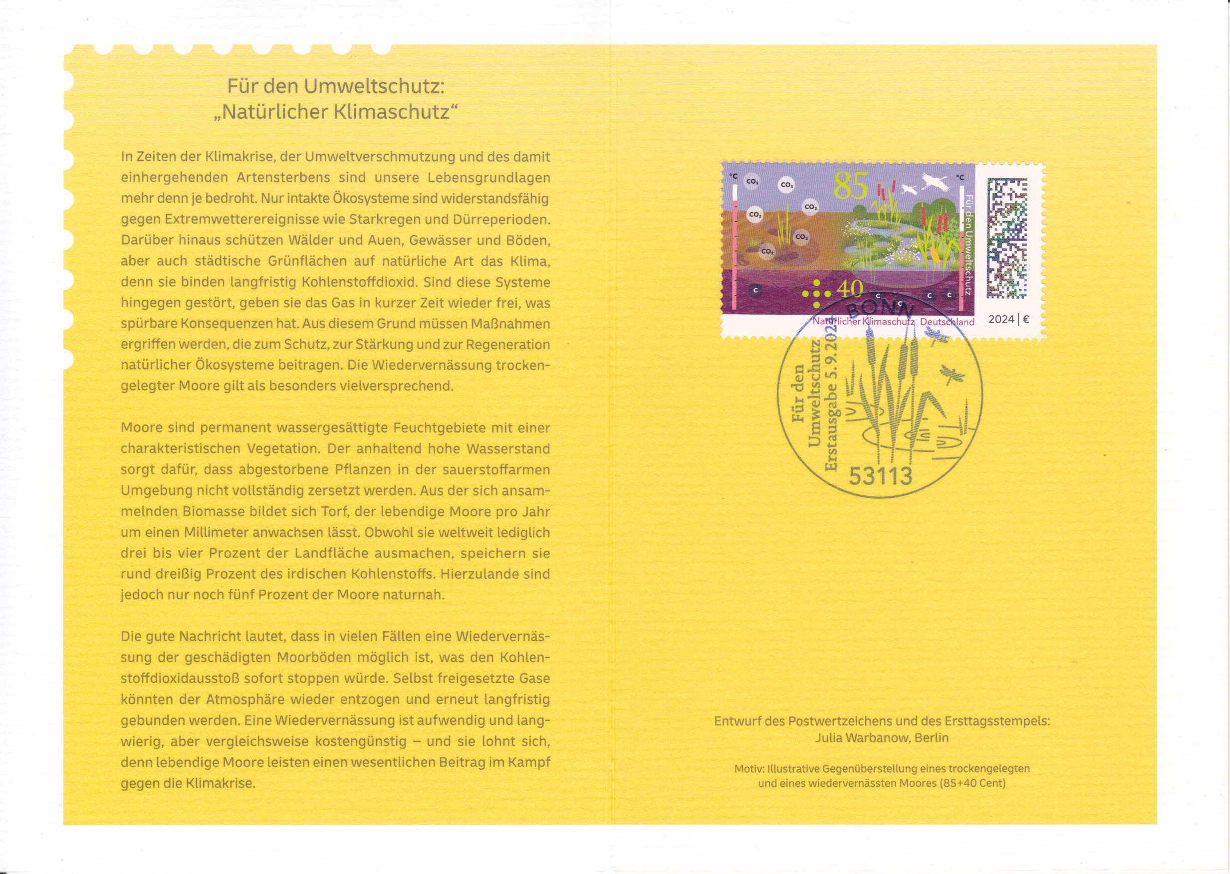 Klappkarte des Vorstandsvorsitzenden der Deutschen Post AG mit einer Marke (MiNr 3850) zum Thema "Umweltschutz - Natürlicher Klimaschutz" mit der Abbildung "Trockengelegtes und intaktes Moor" und dem Ersttagsonderstempel Bonn.