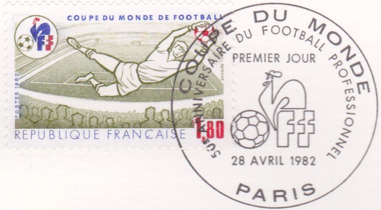 Ergänzend zu der bereits hier auf Seite 2 vorgestellten Marke (MiNr 2331) aus Frankreich zeige ich noch ein "Philatelistisches Dokument" (Document Philatelie Officiel), das von der Briefmarkendruckerei in Boulazac (nähe Perigeux) für die französische Post hergestellt und verkauft wurde. Es enthält die zur WM 1982 in Frankreich erschienene Marke, die mit dem Ersttagsonderstempel Paris gestempelt wurde. Rechts unten ist auch ein einfarbiges Markenbild eingedruckt.