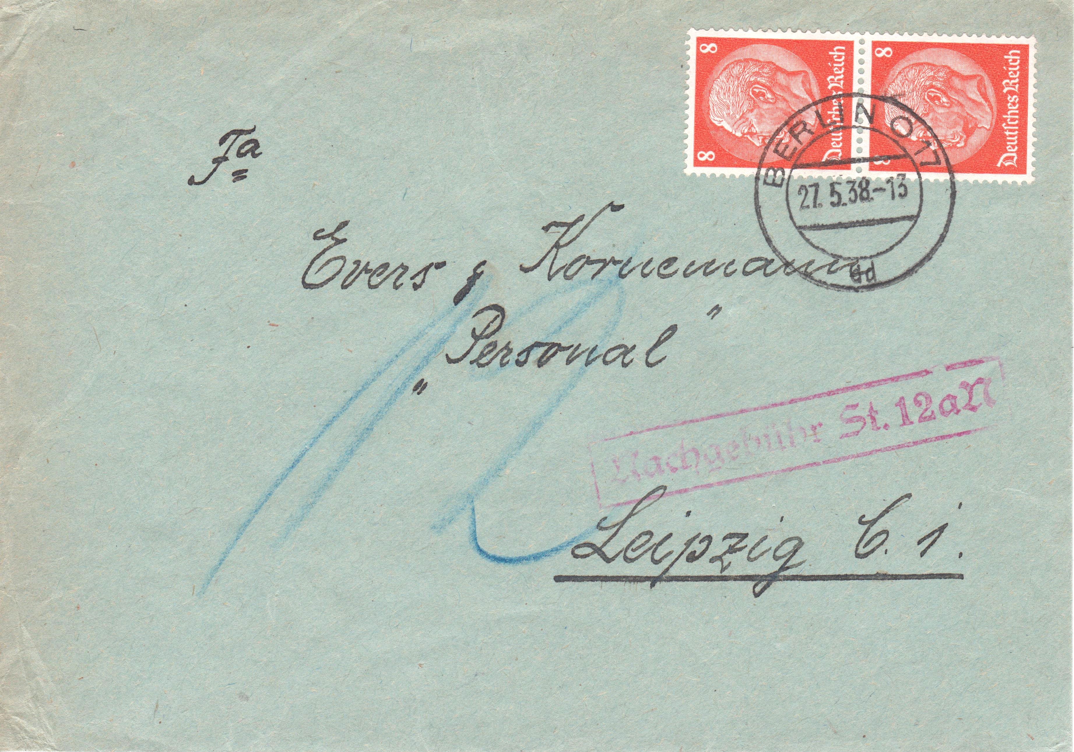 Dieser nach Leipzig adressierte Brief wurde am 27.05.1938 mit 16 Pf = Ortsporto frankiert in BERLIN O 17 aufgegeben: