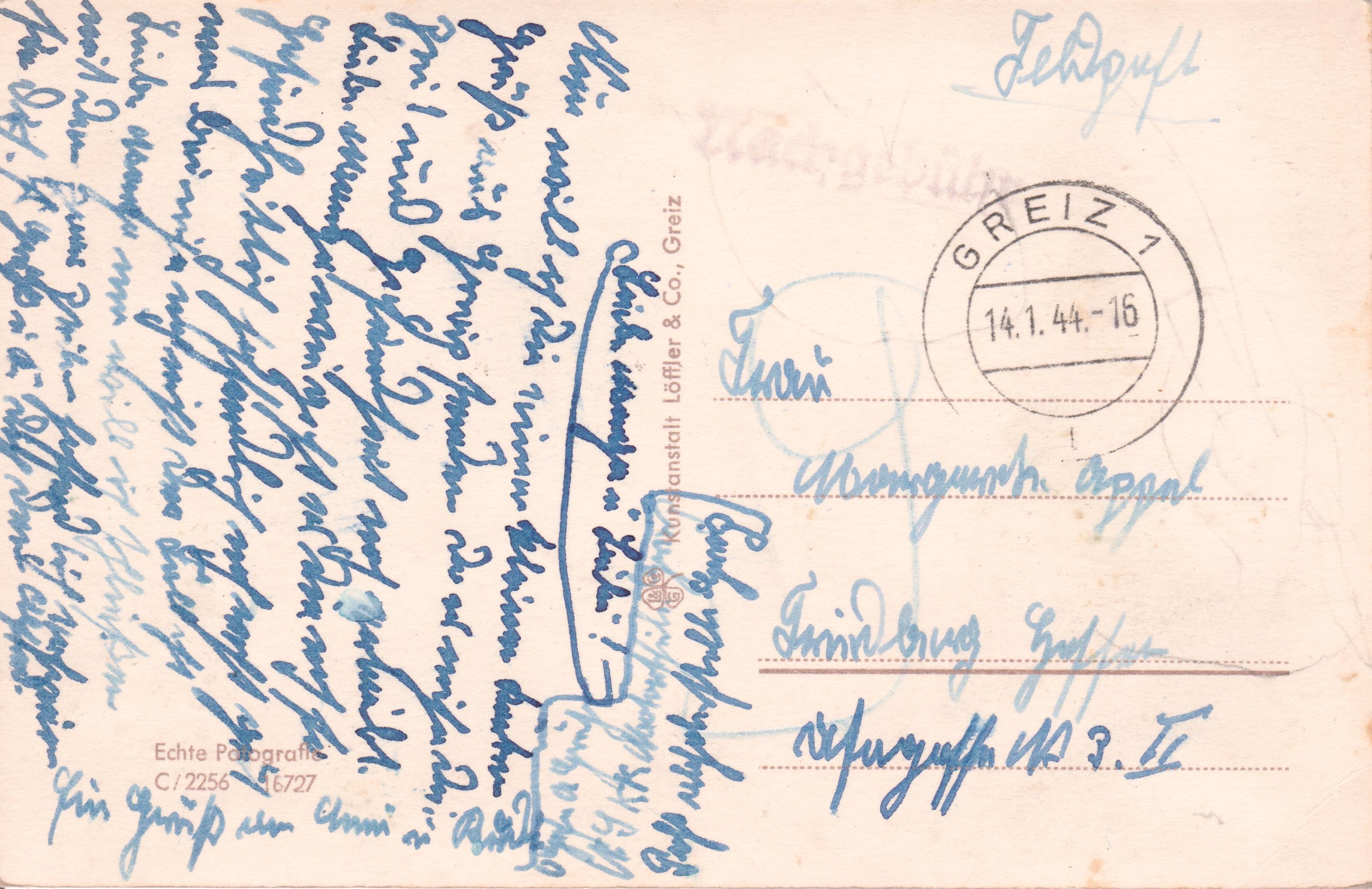 Postkarte, adressiert nach "Friedberg Hessen" unfrankiert mt dem handschriftlichen Vermerk "Feldpost" aufgegeben am 14.01.1944 in GREIZ 1: