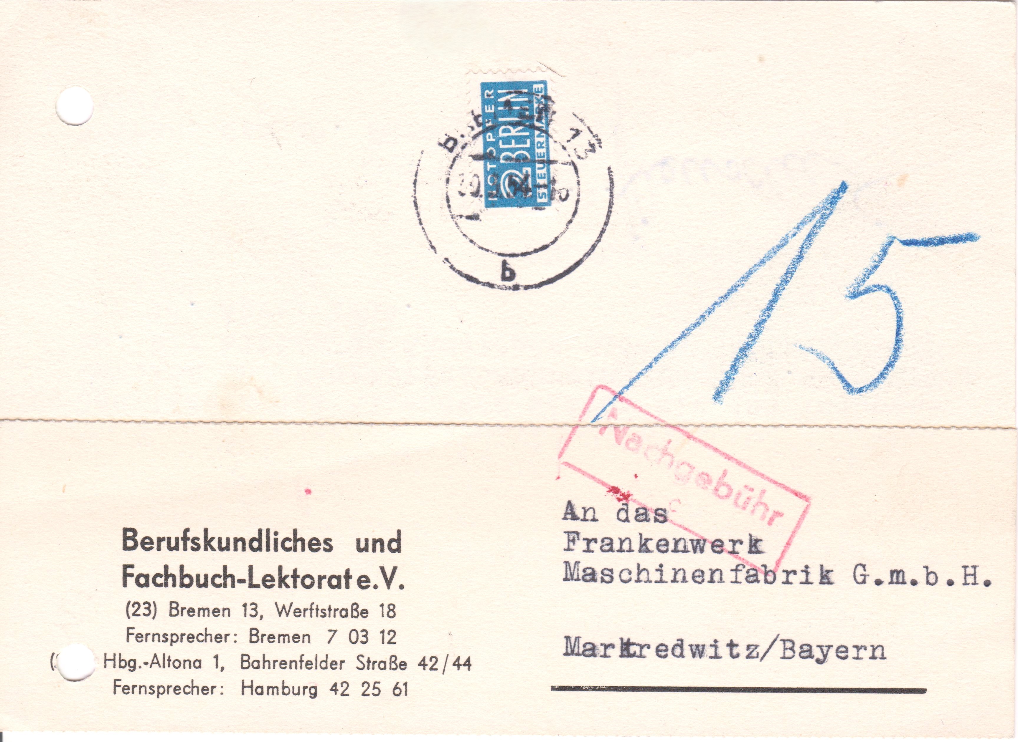 Das Eineinhalbfache des Fehlportos von 10 Pfennig für eine Postkarte im Fernverkehr wurde als "15" Pf Fehlporto per Blaustift ausgewiesen und beim Empfänger als "Nachgebühr" erhoben, worauf ein Stempel in Rot "Nachgebühr c" hinweist!