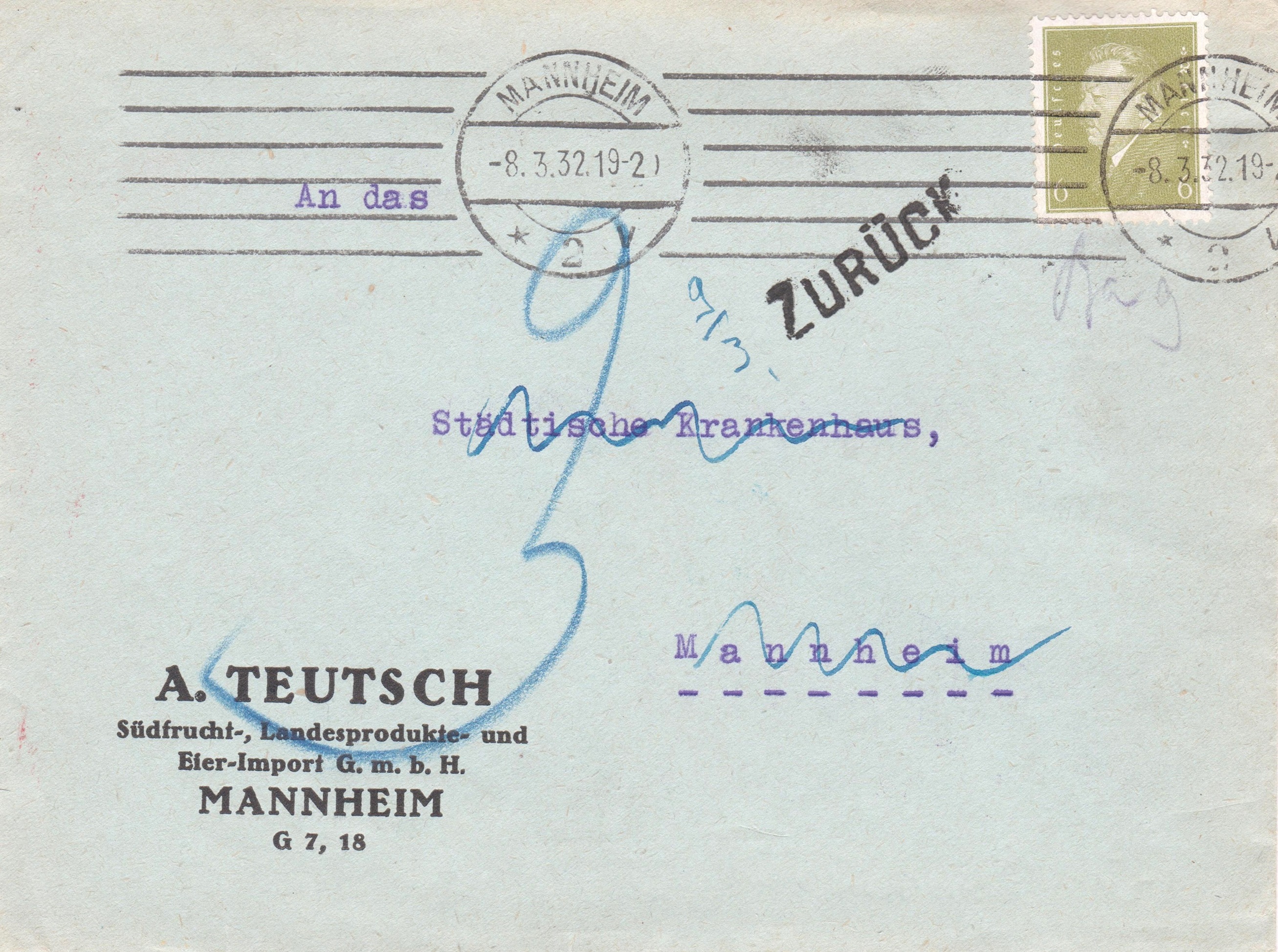 Dieser Brief im Ortsverkehr von Mannheim wurde statt mit 8 Pf lediglich mit 6 Pf freigemacht: