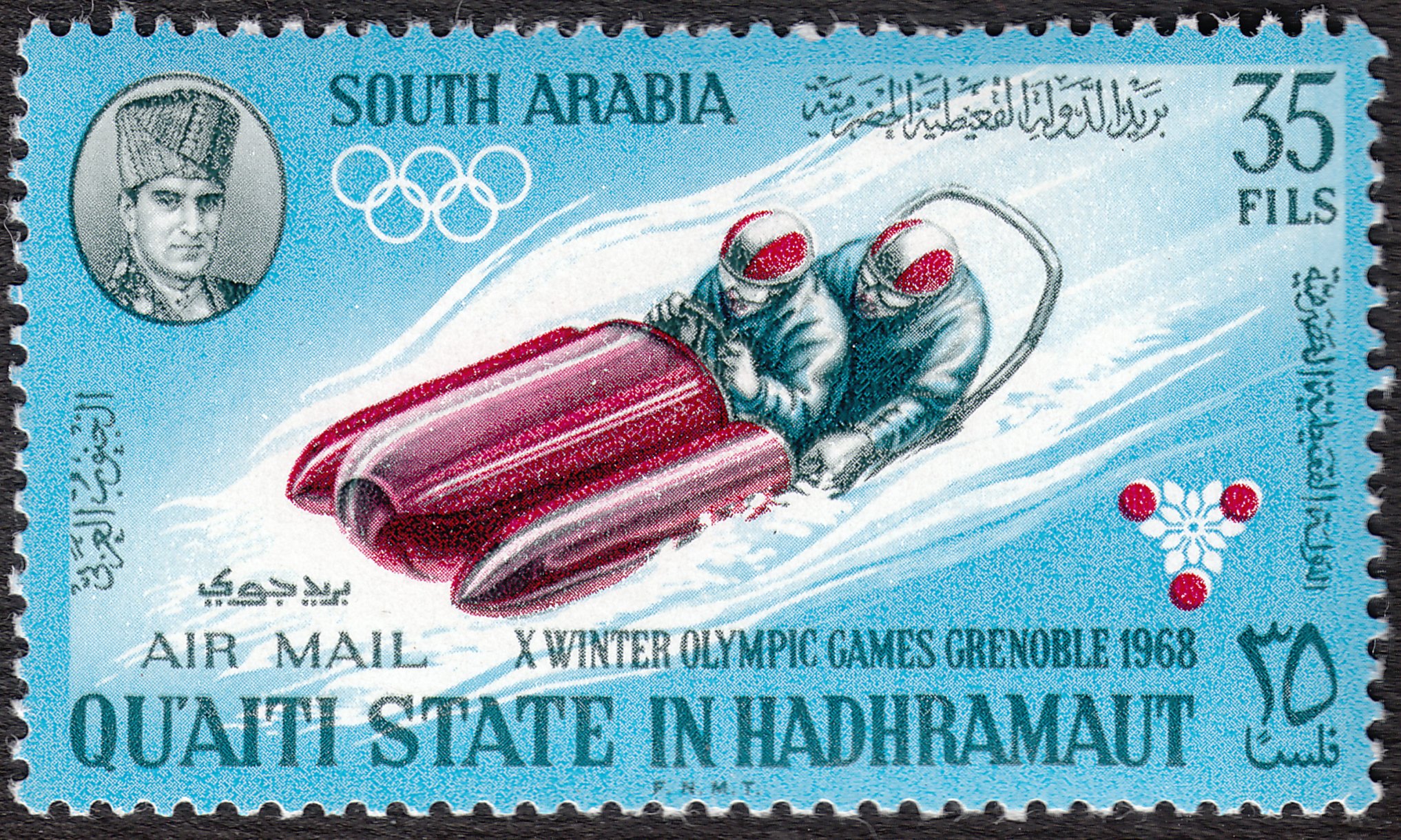 Diese "Briefmarke" aus dem "KATHIRI STATE OF SEIYUN" zeigt einen Zweierbob, bei dem sich beide Insassen unterschiedlich stark "in die Kurve legen", obwohl er augenscheinlich geradeaus fährt: