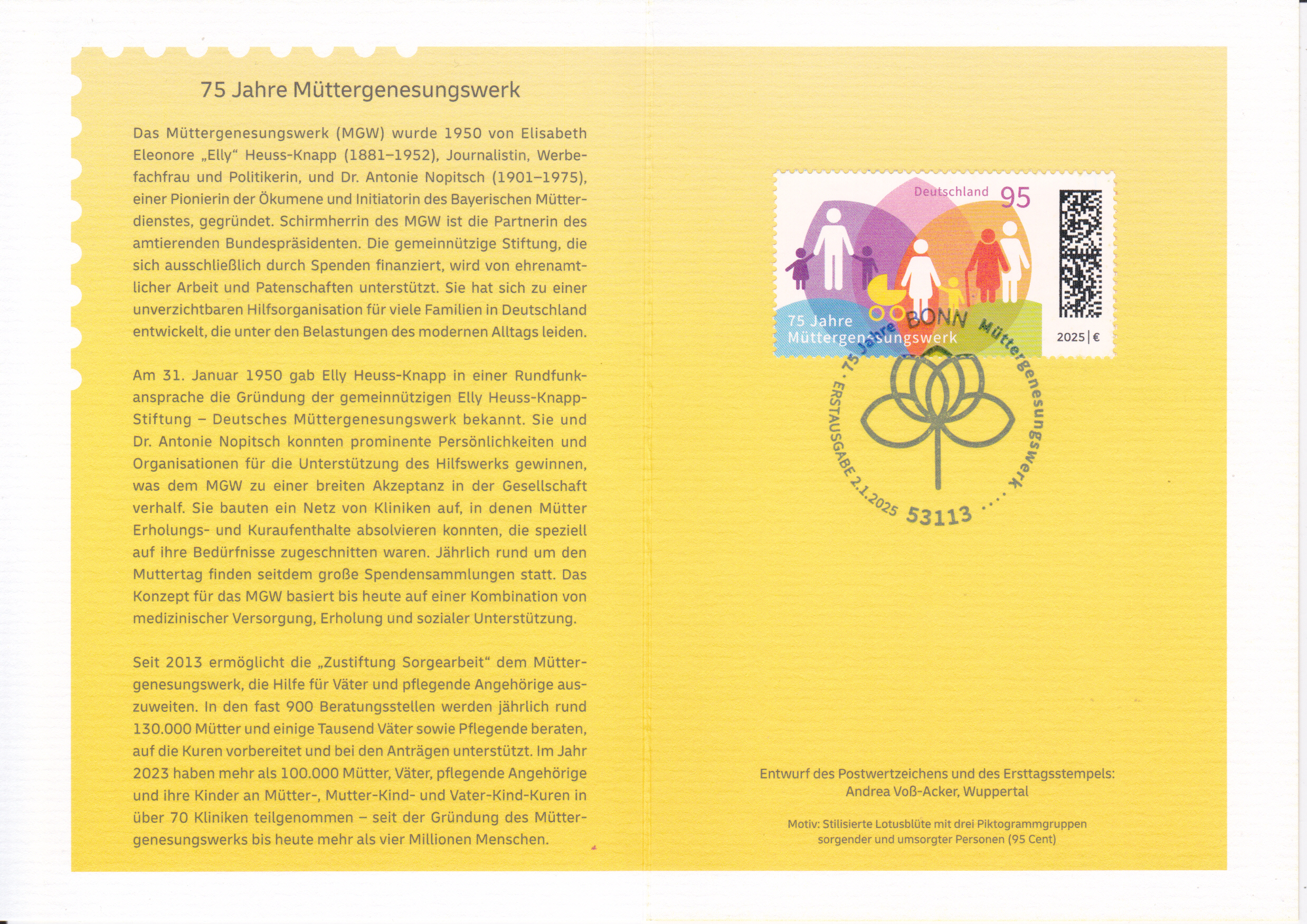 Klappkarte des Vorstandsvorsitzenden der Deutschen Post AG mit der Marke (MiNr 3881) zum Jubiläum "75 Jahre Müttergenesungswerk" und dem Ersttagsonderstempel Bonn.