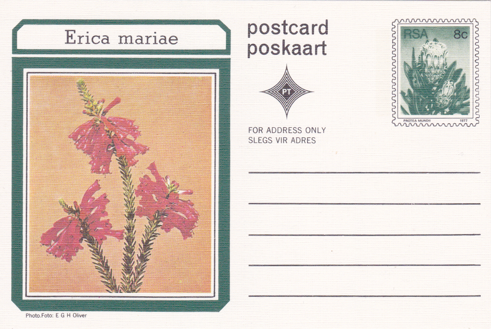 Auf dieser Bildpostkarte sind im Zudruck Blüten der Erica strigilifolia zu sehen.
