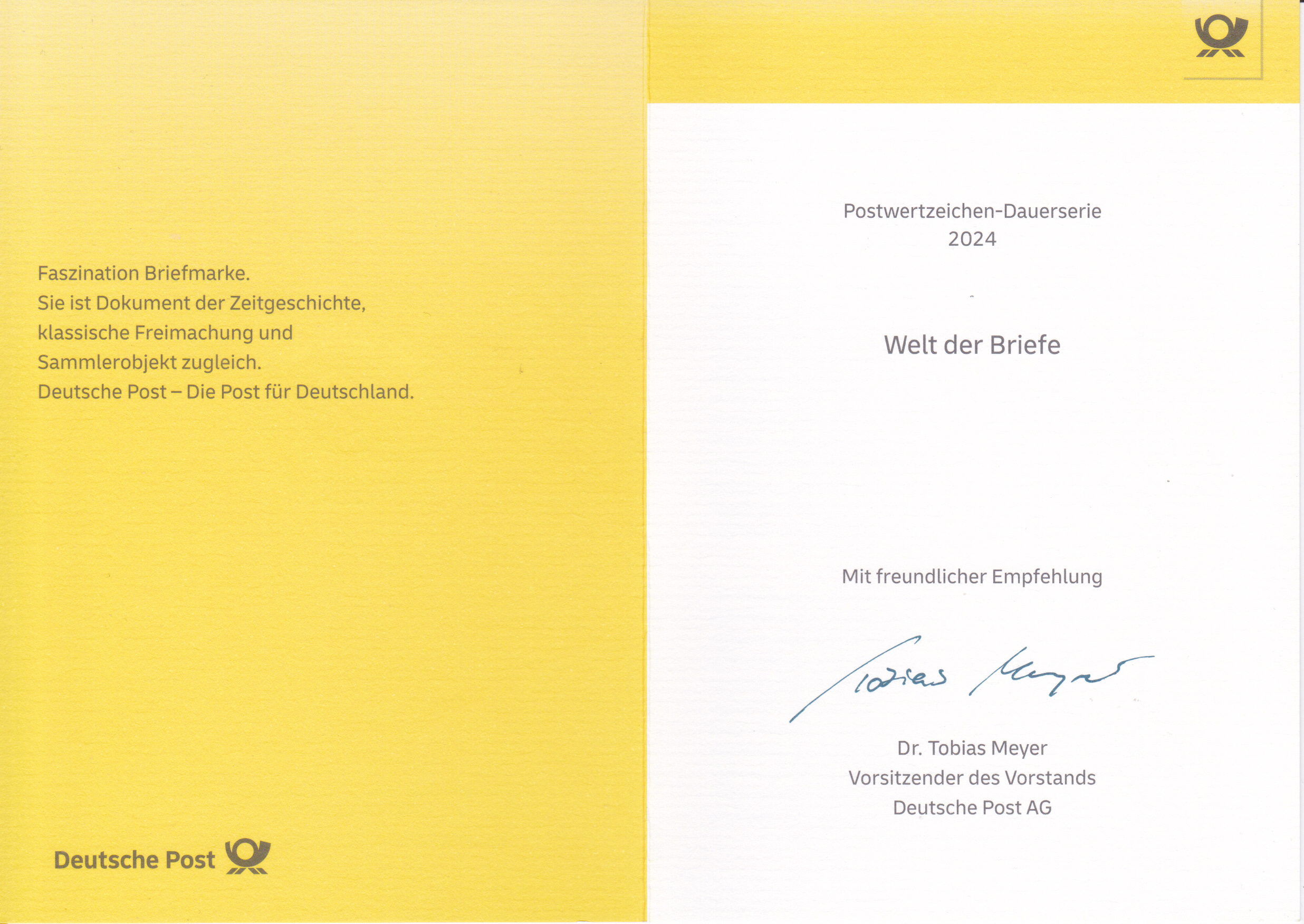 Klappkarte des Vorstandsvorsitzenden der Deutschen Post AG mit der Marke (MiNr 3870) zu 180 Cent mit dem Motiv "Buntstift als Rakete vor Erdball" aus der Dauerserie "Welt der Briefe" und dem Ersttagsonderstempel Bonn.