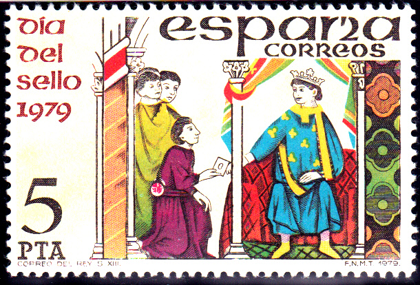 Zum Tag der Briefmarke 1979 erschien in Spanien am 15.6.1979 diese Marke (MiNr 2418) mit der Abbildung "Bote überreicht dem König einen Brief" aus dem Códice Escurialense de las Cantigas von Alfons X. (13. Jh.).
