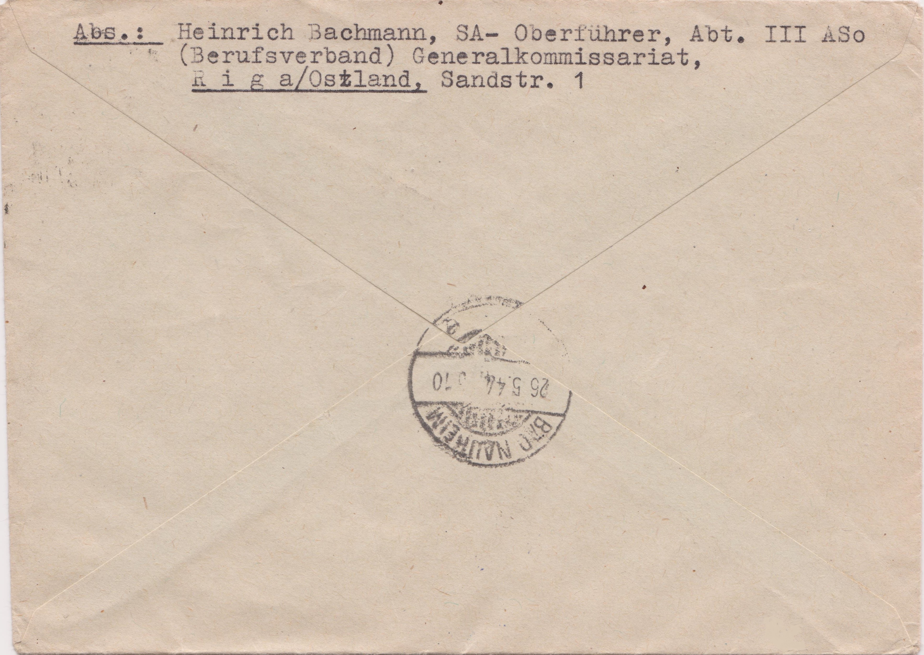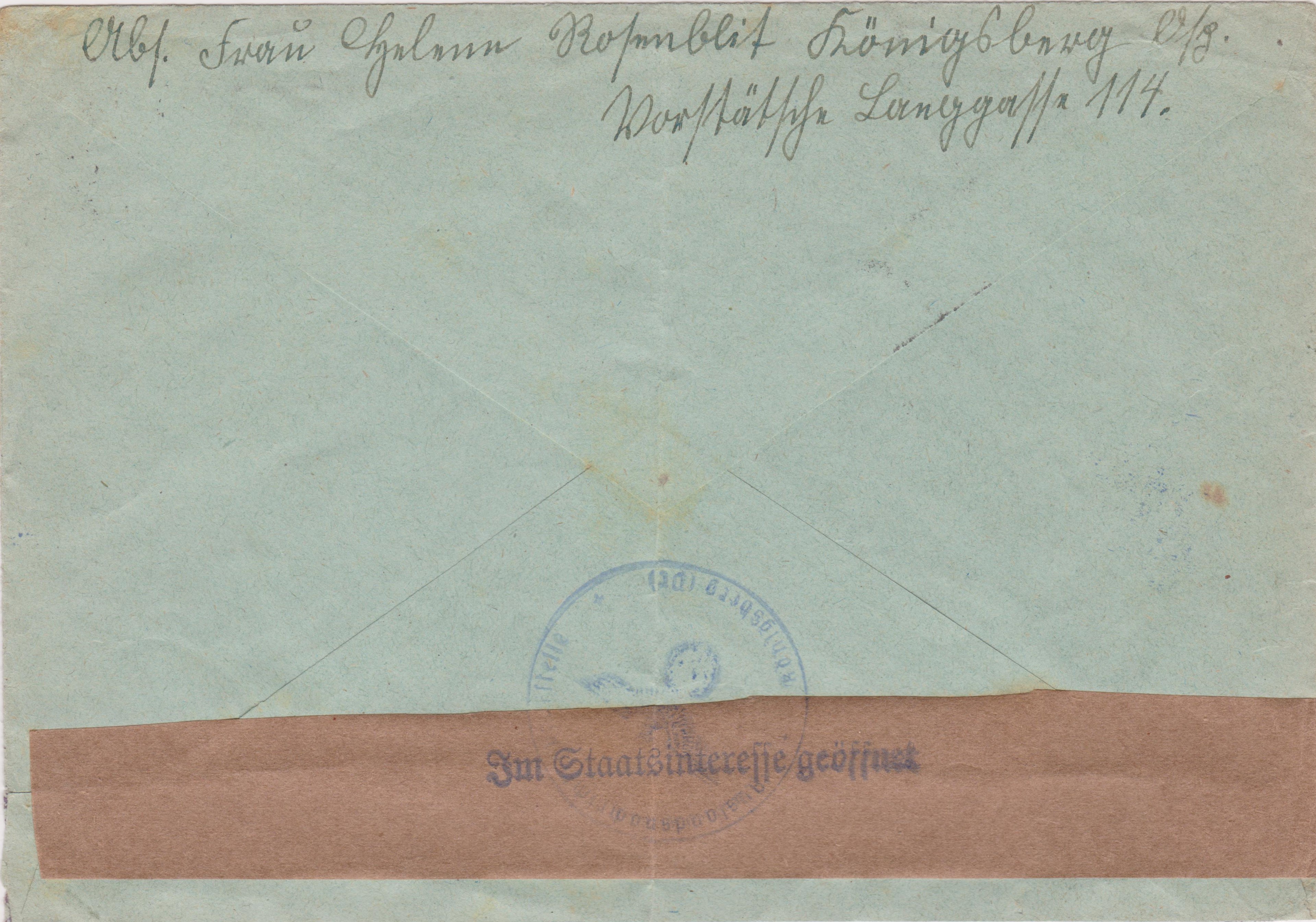 Der Beleg wurde rückseitig geöffnet und nach erfolgter Zensur mit einem neutralen Verschlußstreifen "Im Staatsinteresse geöffnet", Landsmann AV1.6, wieder verschlossen.