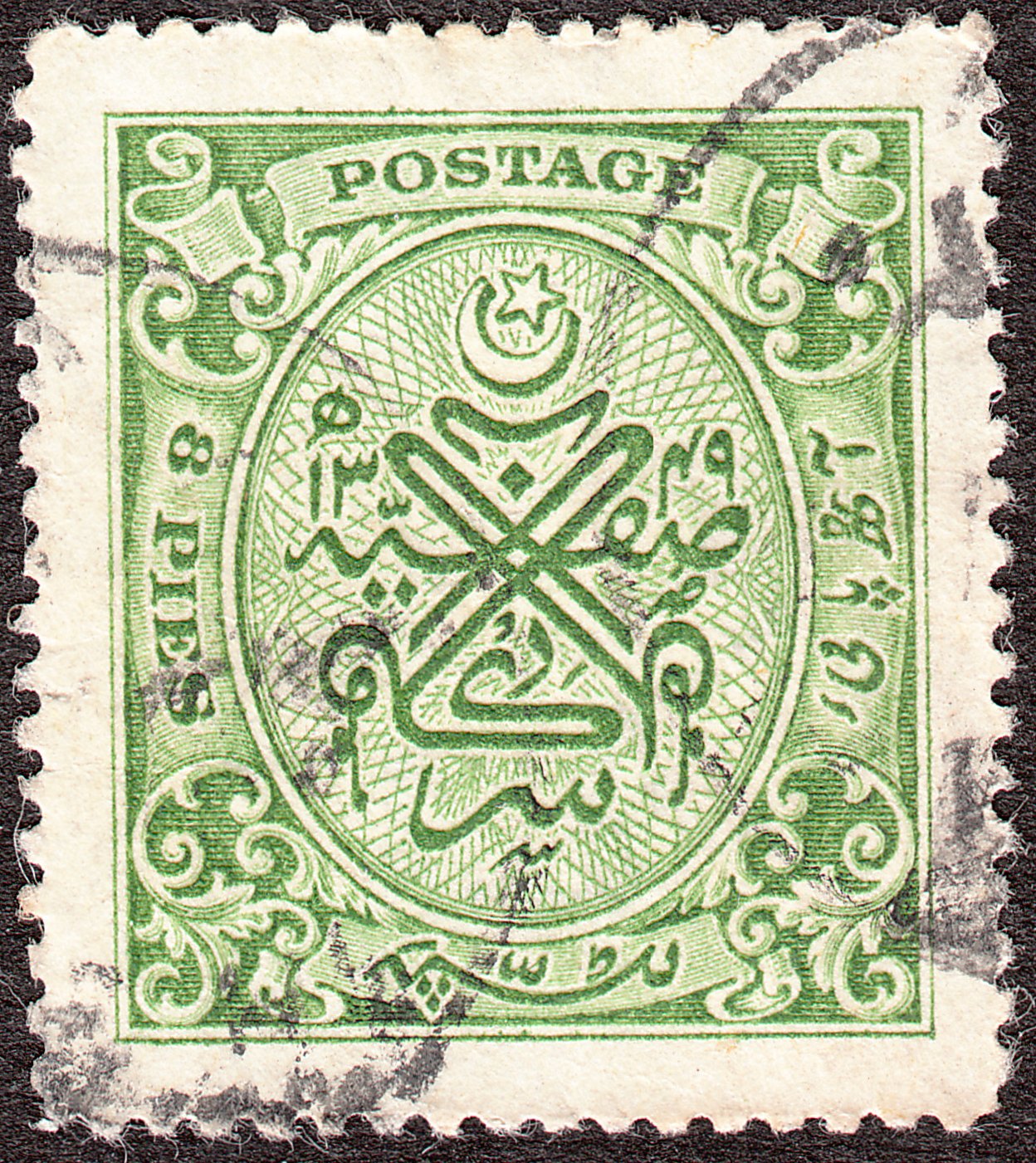 Diese Freimarke zu 8 Pies in grün erschien am 12.11.1931 und wurde als Hyderabad MiNr. 29 katalogisiert: